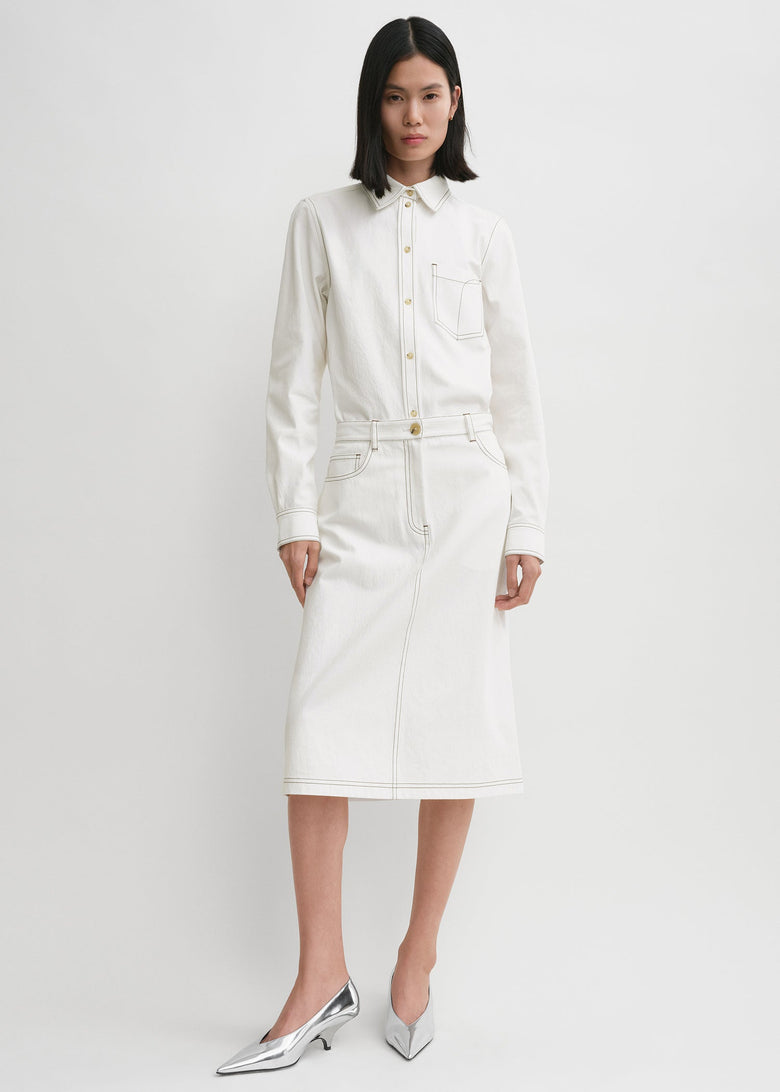 Mini, midi and long, slim and oversized TOTEME dresses and skirts crafted from fine materials like silk, cotton, linen, leather and wool.
