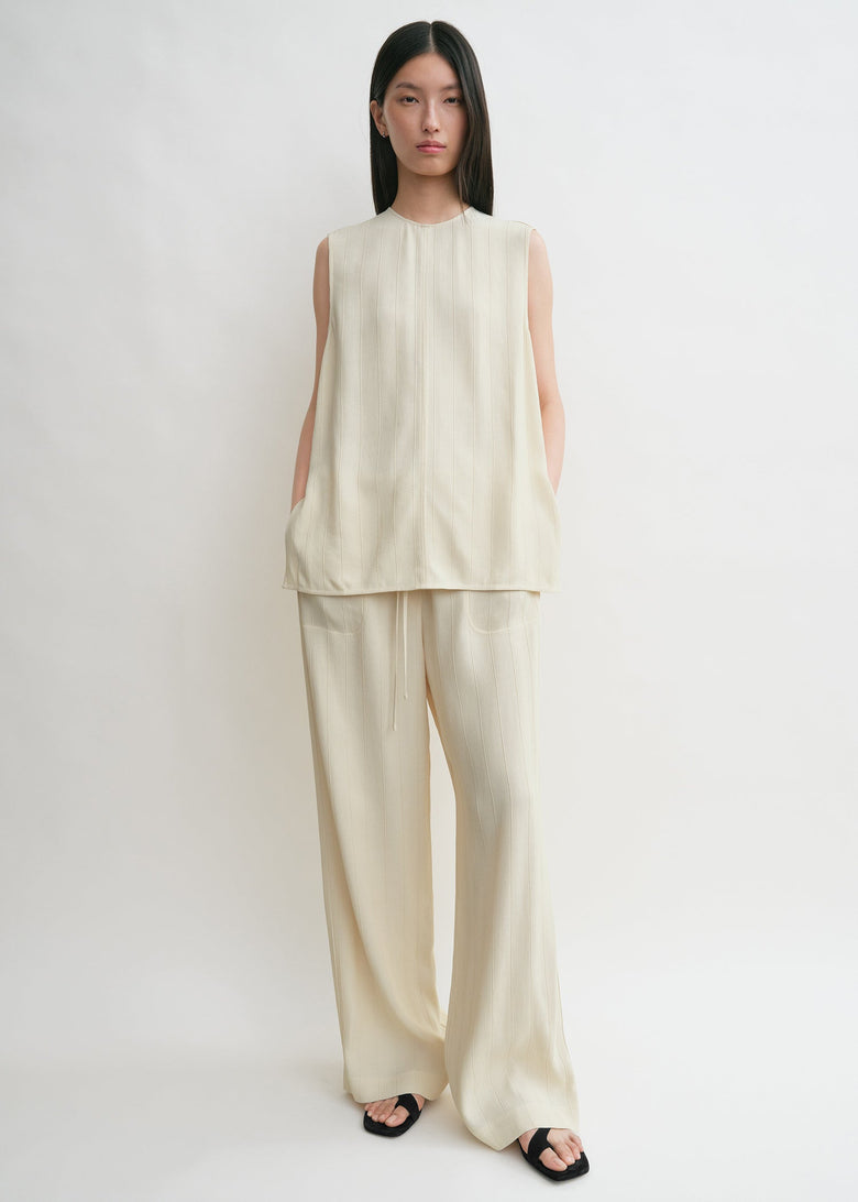 A curated TOTEME collection of sculpting tanks, relaxed T-shirts, and graceful blouses, crafted from cotton, silk, linen, and wool.