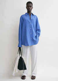 Classic TOTEME summer shirt woven from light and fresh cotton and linen accented with cobalt-blue and white stripes bringing a pop of color to your summer wardrobe. Cut to a menswear-inspired, over...