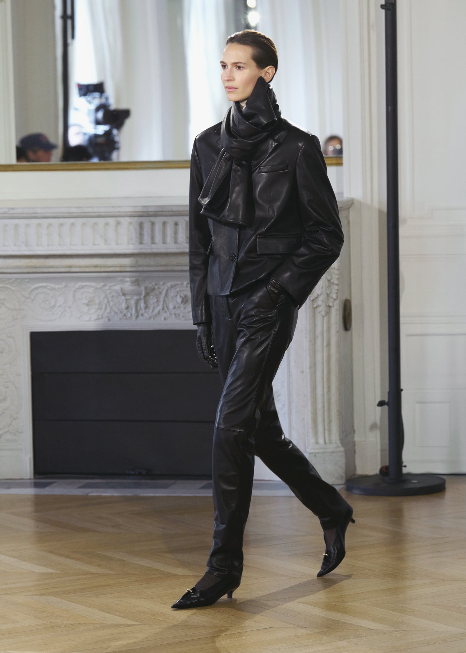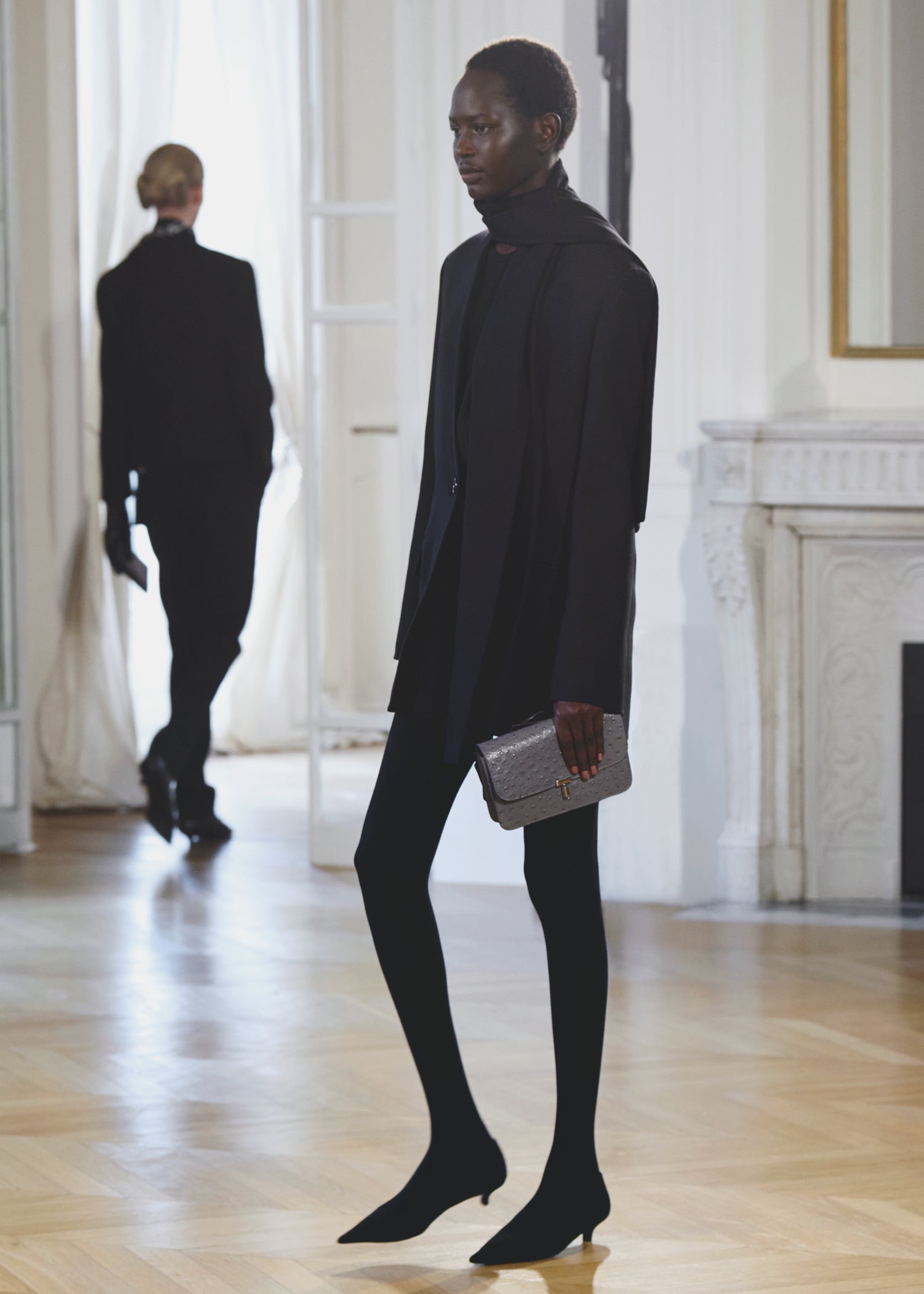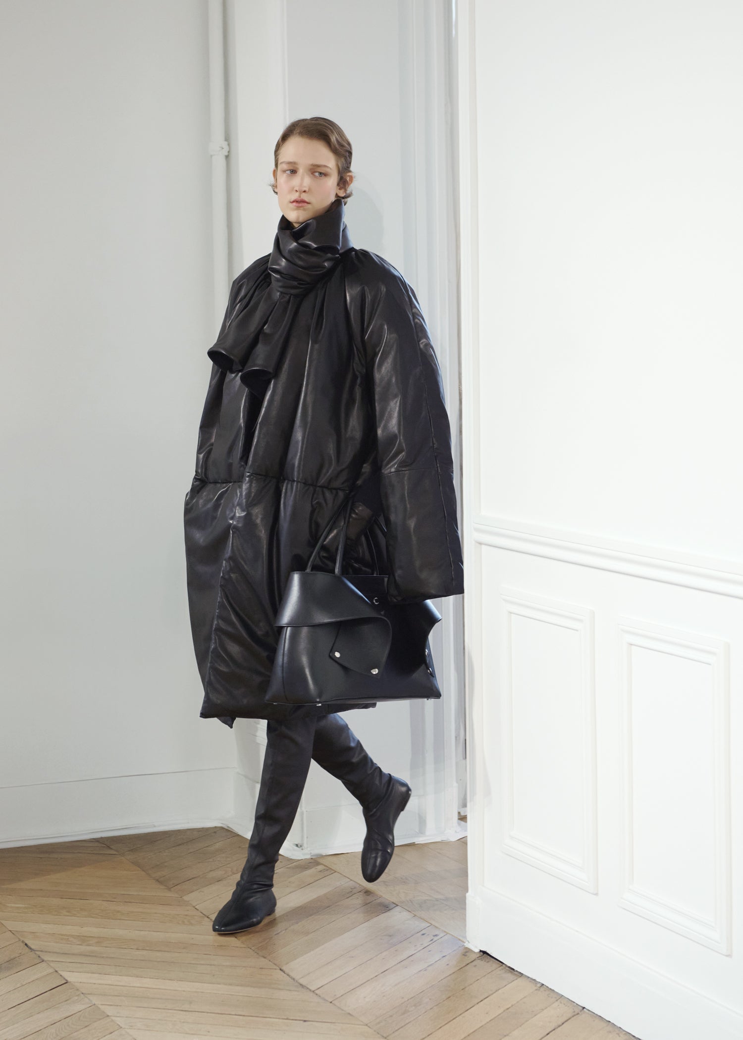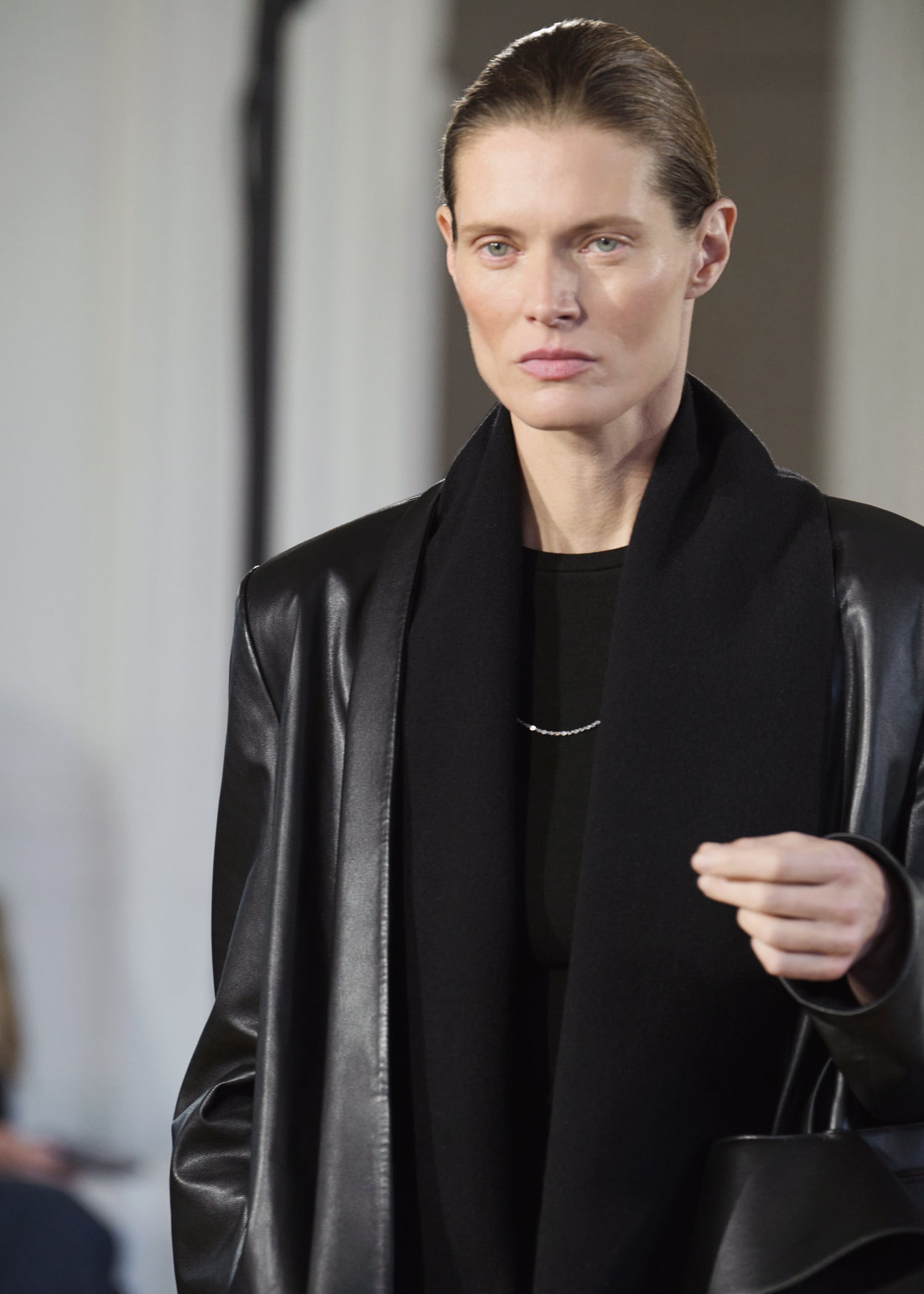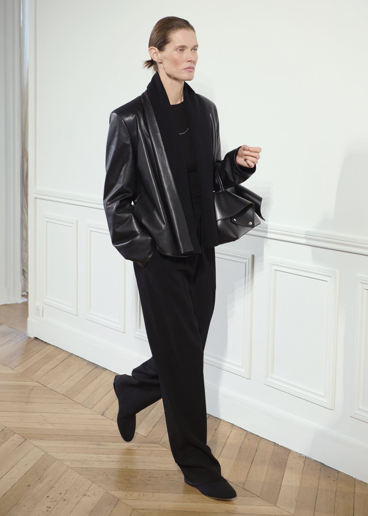 Expressive in its Swedish-inflected sophistication, the Fall Winter 26 runway collection is an exercise in feminine verve. Athletic, wardrobe-building pieces are lent renewed stridency with the kick of a sculptural silhouette. Seemingly minimalist fabrics in shades of noir, with a pop of cherry red, are endowed with unexpected drama, including buttery leather lined with cashmere. Pierced-toe leather pumps lend edge and bags skew city-slick, with the biker-coded Mercer tote joining the lineup alongside the T-lock slung crossbody on ornamental chains. True to TOTEME, each look is an invitation to personality, serving a woman of substance.