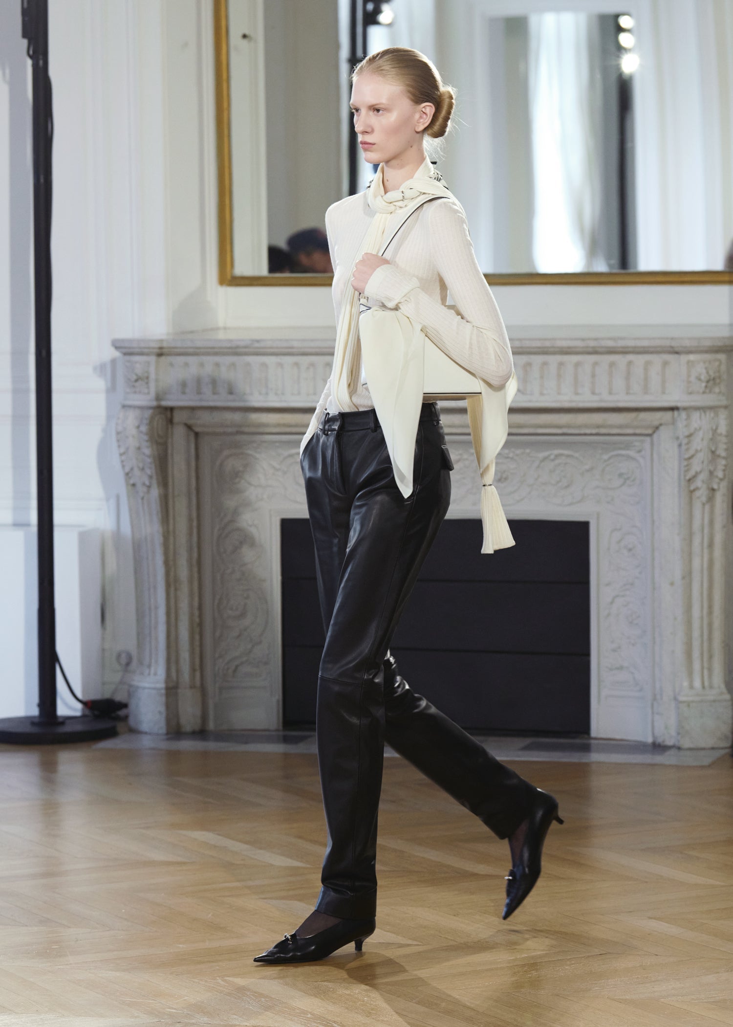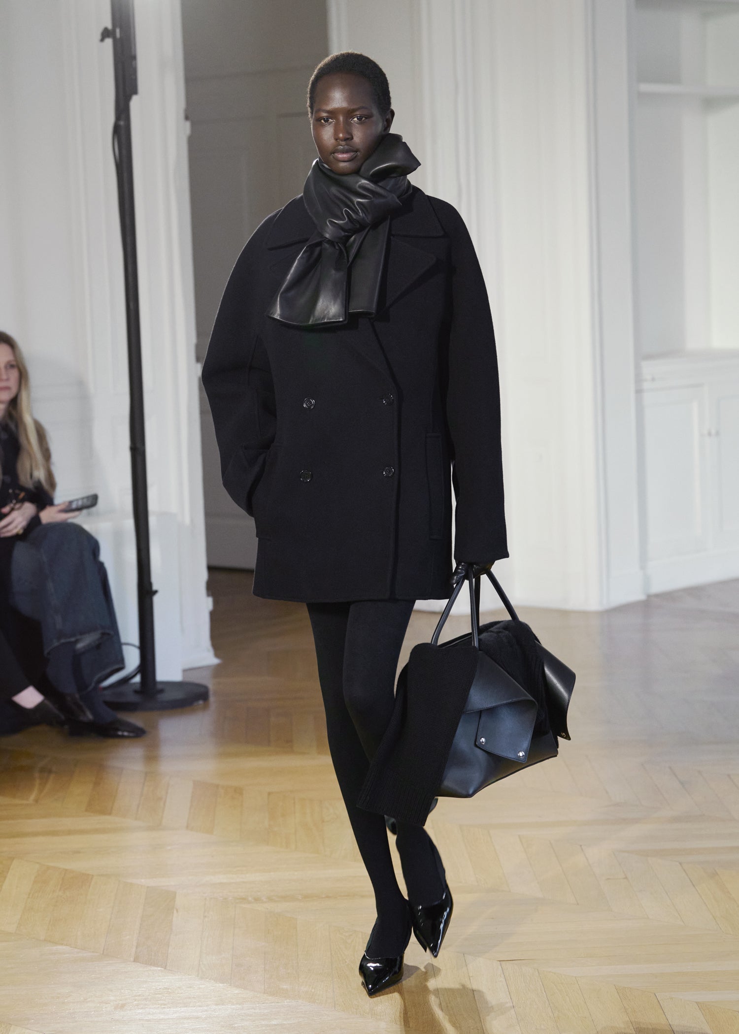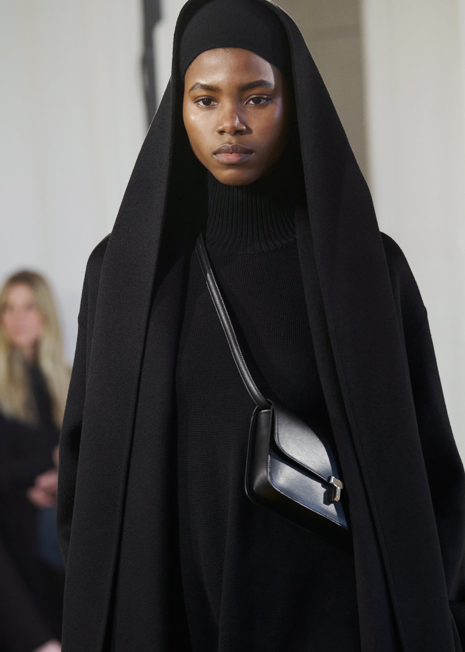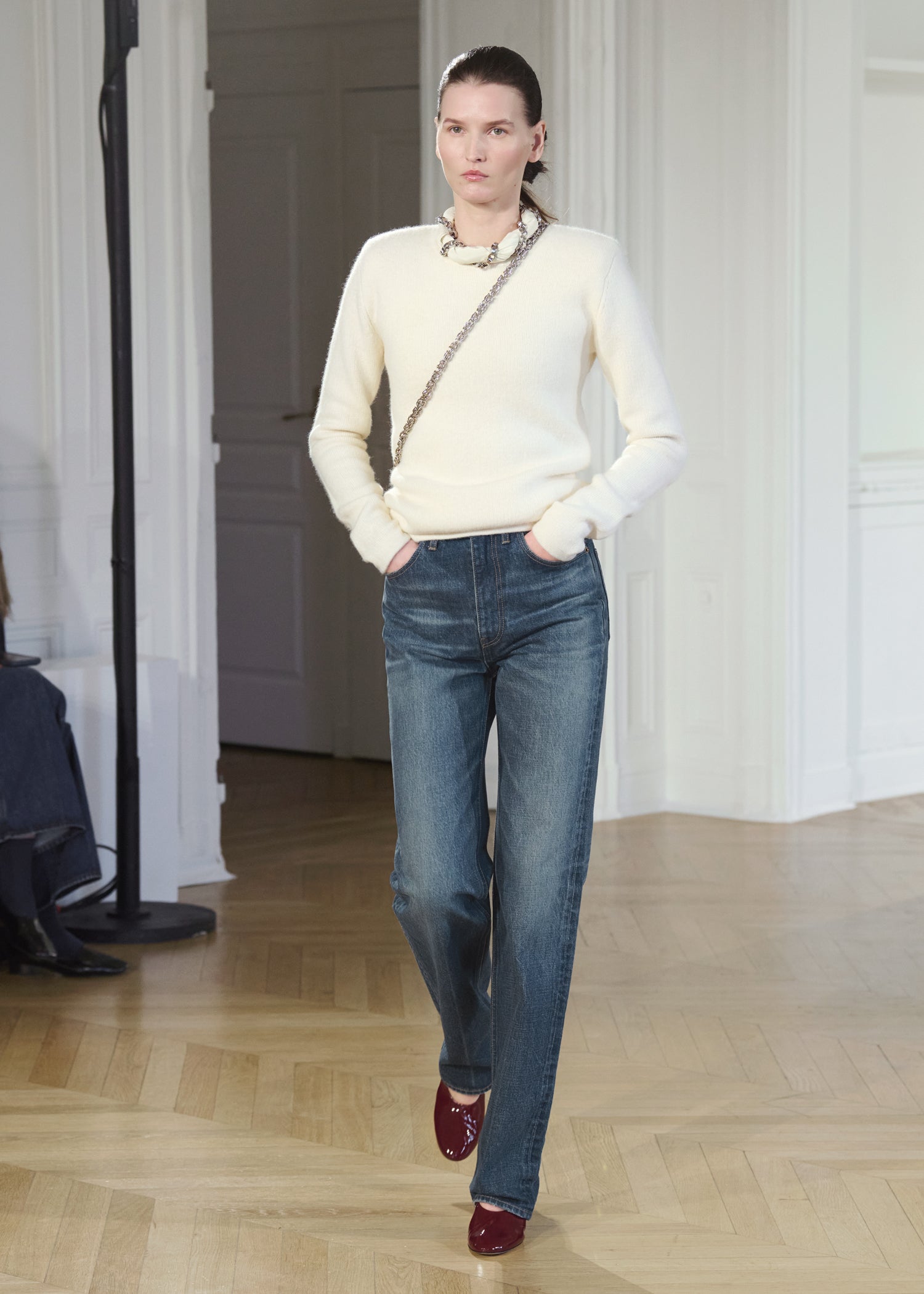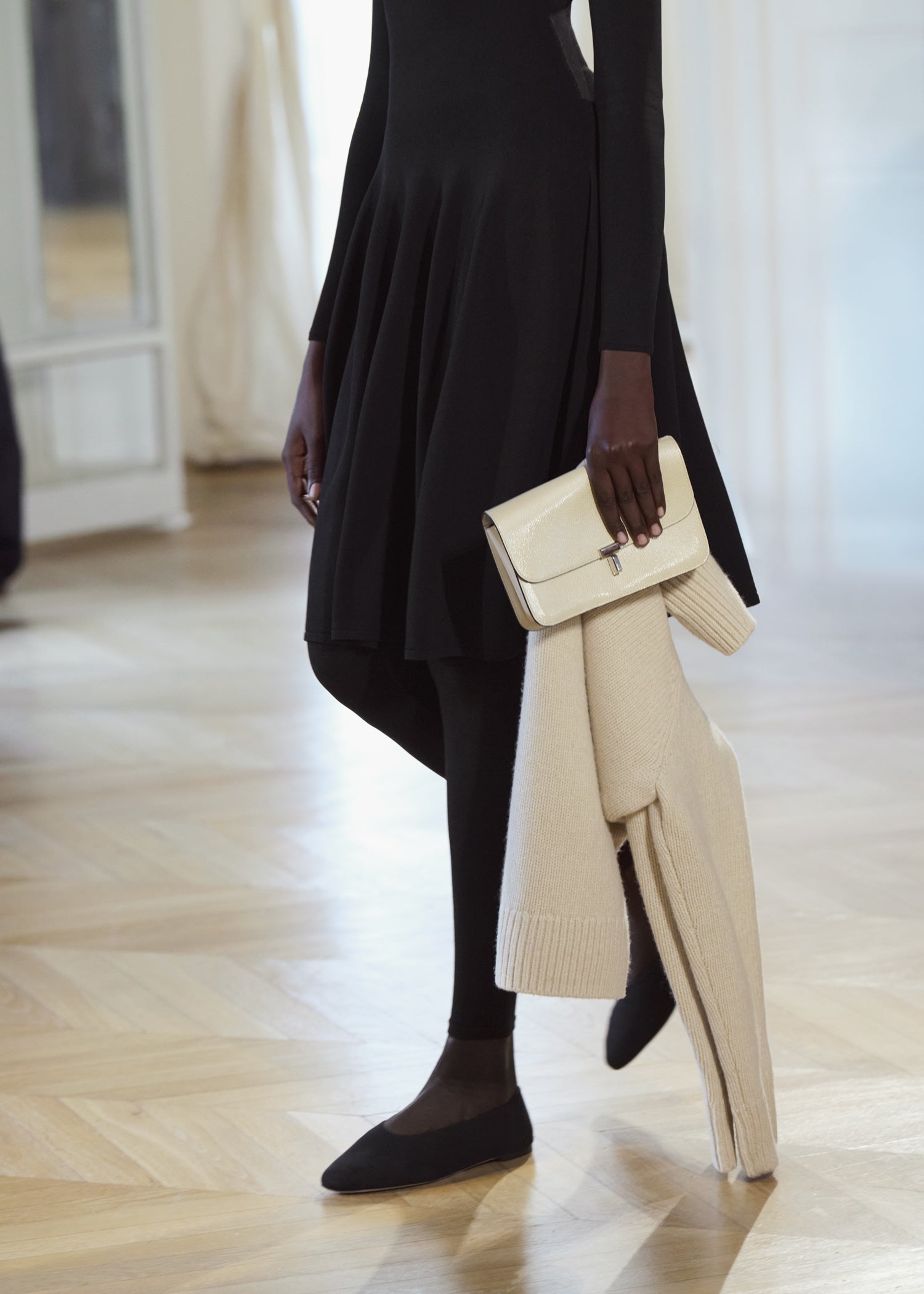 Expressive in its Swedish-inflected sophistication, the Fall Winter 26 runway collection is an exercise in feminine verve. Athletic, wardrobe-building pieces are lent renewed stridency with the kick of a sculptural silhouette. Seemingly minimalist fabrics in shades of noir, with a pop of cherry red, are endowed with unexpected drama, including buttery leather lined with cashmere. Pierced-toe leather pumps lend edge and bags skew city-slick, with the biker-coded Mercer tote joining the lineup alongside the T-lock slung crossbody on ornamental chains. True to TOTEME, each look is an invitation to personality, serving a woman of substance.