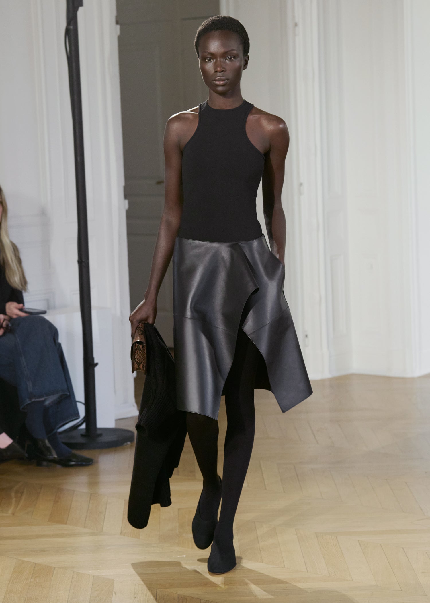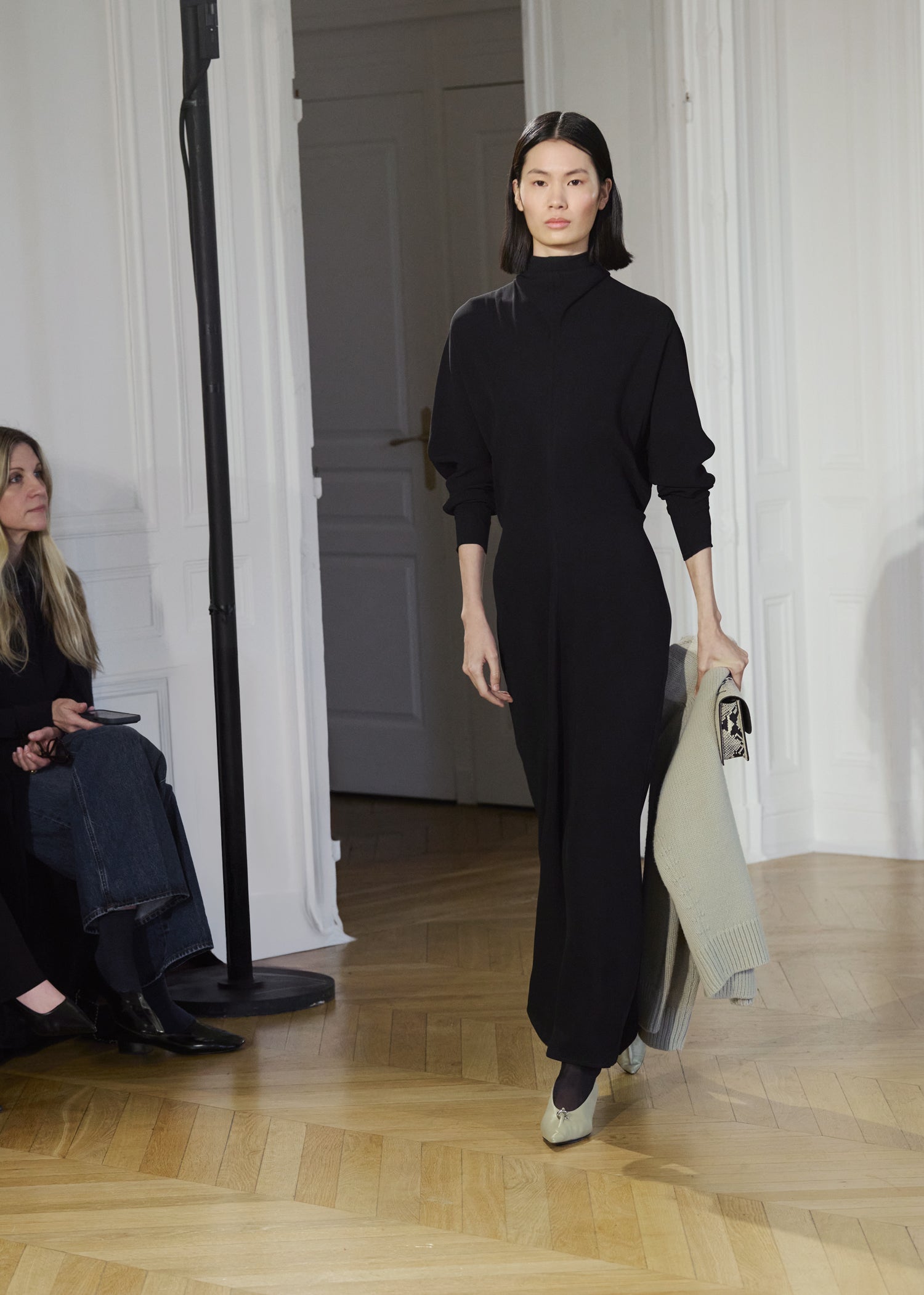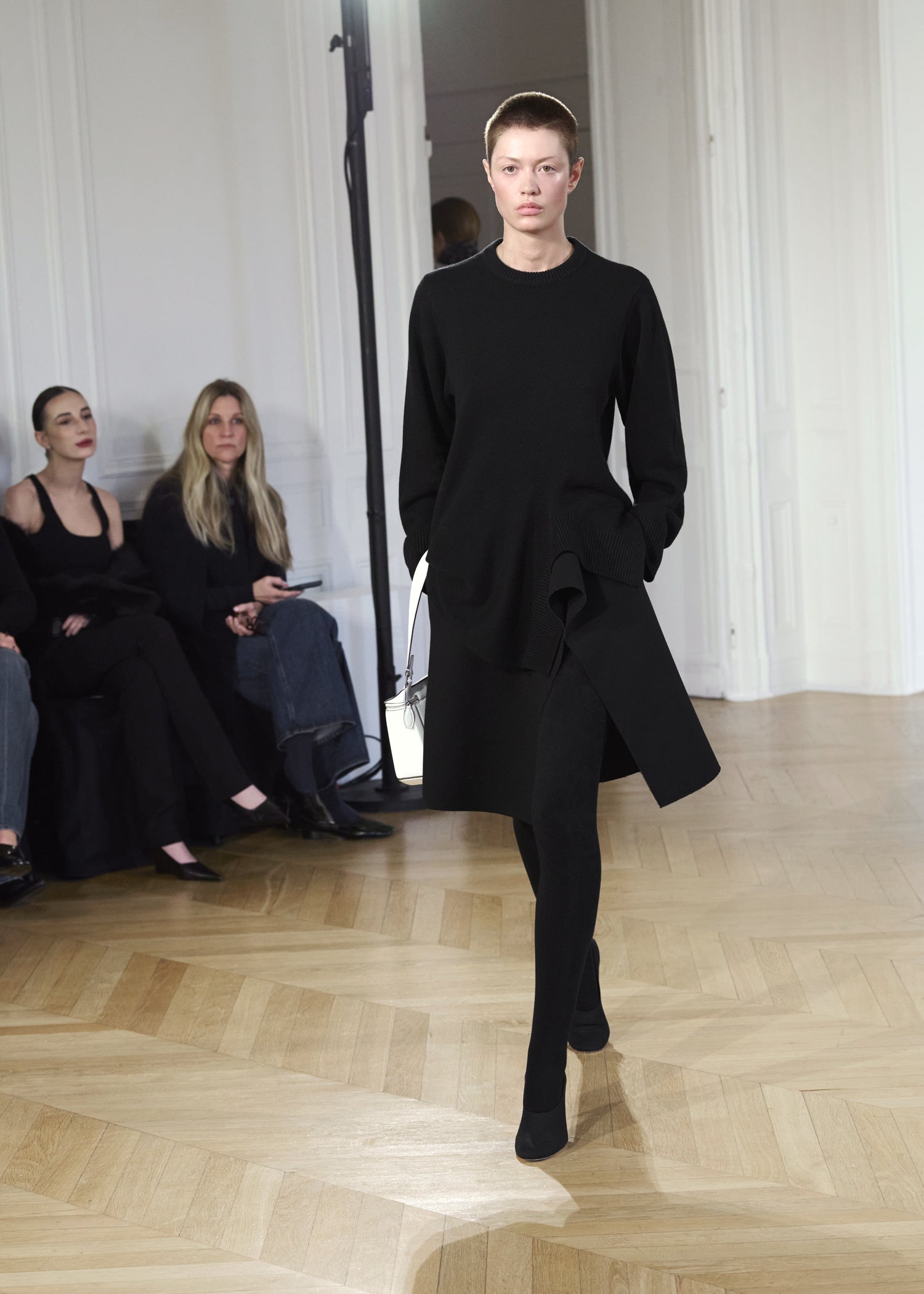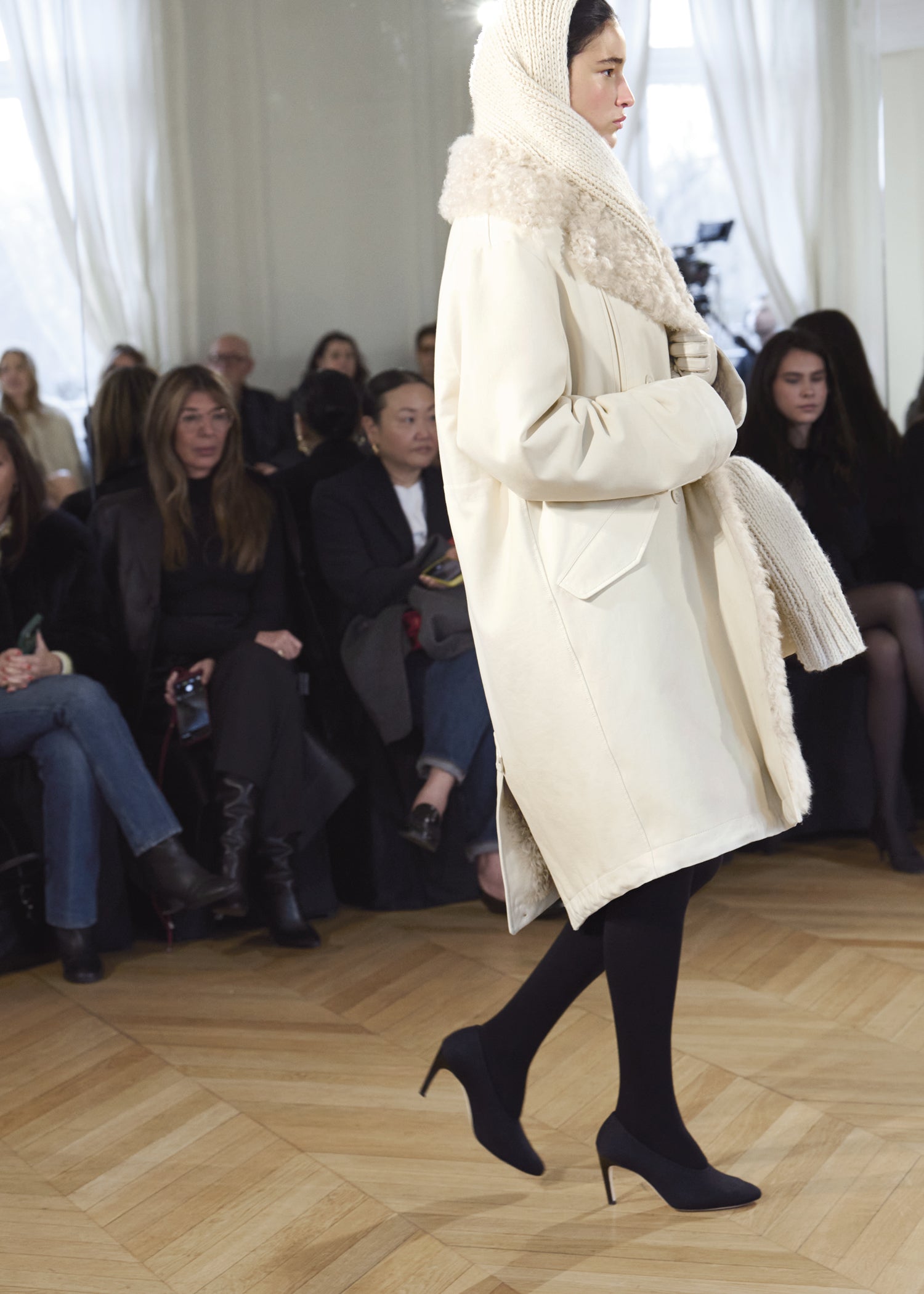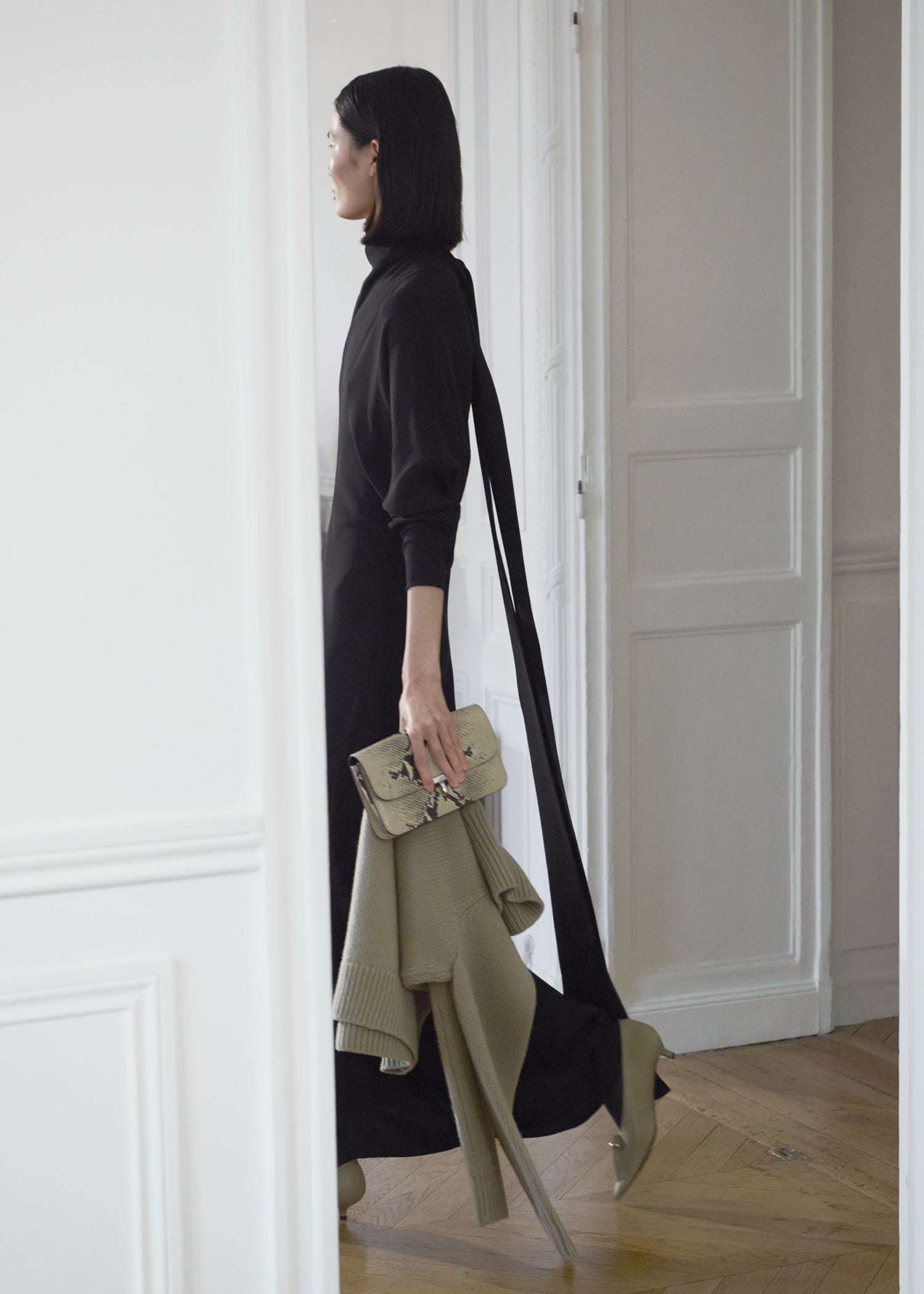 Expressive in its Swedish-inflected sophistication, the Fall Winter 26 runway collection is an exercise in feminine verve. Athletic, wardrobe-building pieces are lent renewed stridency with the kick of a sculptural silhouette. Seemingly minimalist fabrics in shades of noir, with a pop of cherry red, are endowed with unexpected drama, including buttery leather lined with cashmere. Pierced-toe leather pumps lend edge and bags skew city-slick, with the biker-coded Mercer tote joining the lineup alongside the T-lock slung crossbody on ornamental chains. True to TOTEME, each look is an invitation to personality, serving a woman of substance.