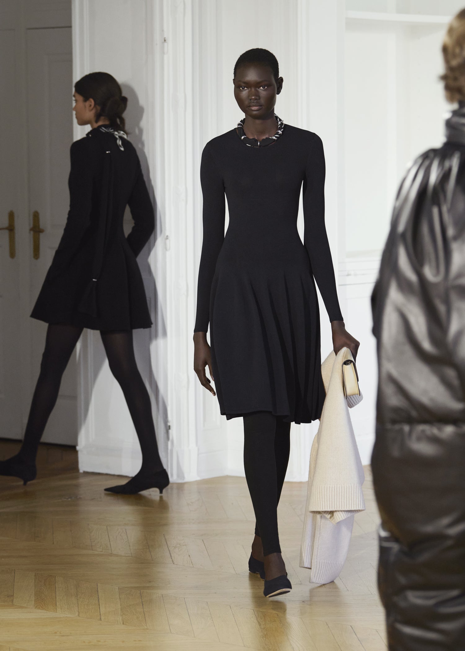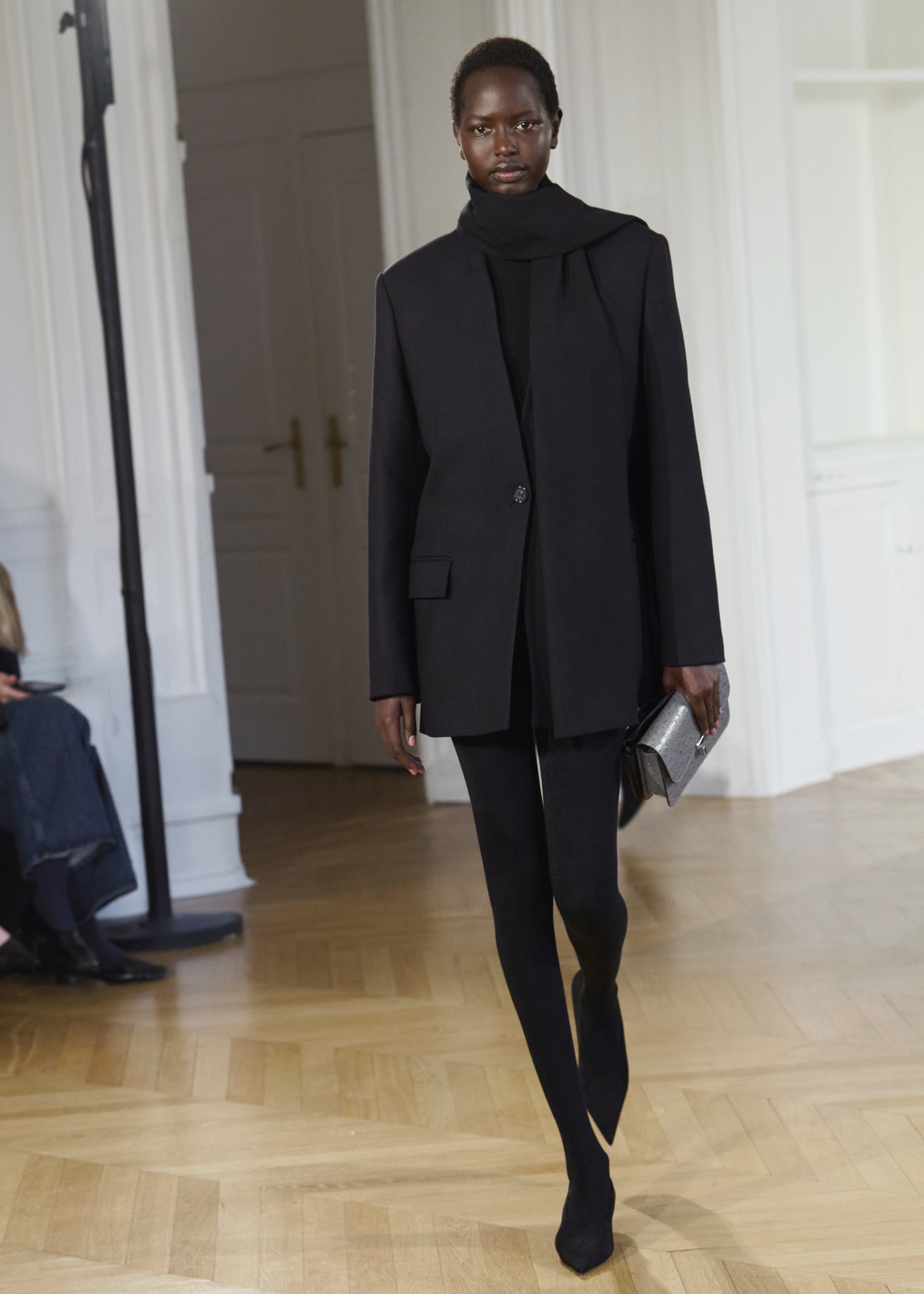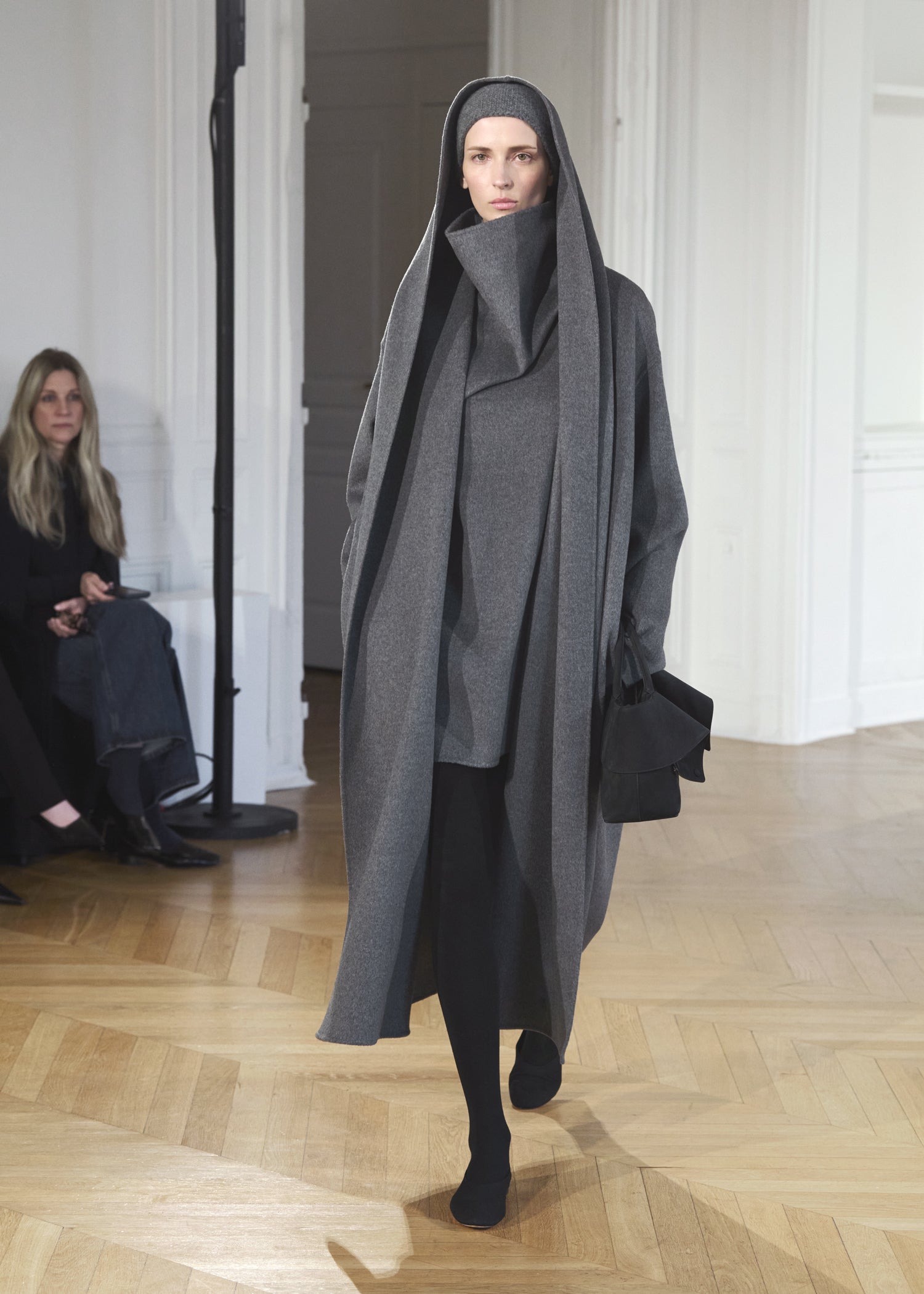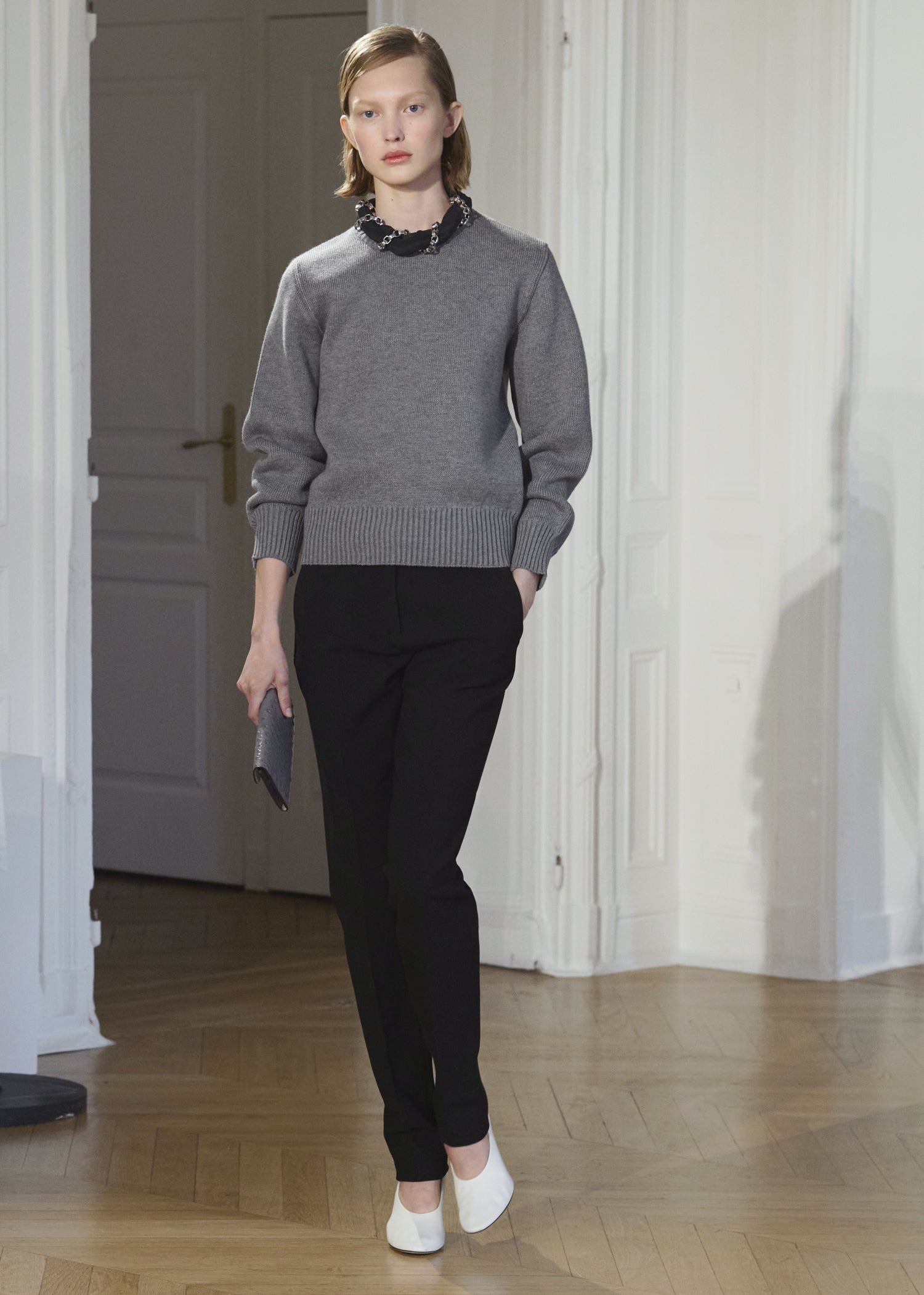 Expressive in its Swedish-inflected sophistication, the Fall Winter 26 runway collection is an exercise in feminine verve. Athletic, wardrobe-building pieces are lent renewed stridency with the kick of a sculptural silhouette. Seemingly minimalist fabrics in shades of noir, with a pop of cherry red, are endowed with unexpected drama, including buttery leather lined with cashmere. Pierced-toe leather pumps lend edge and bags skew city-slick, with the biker-coded Mercer tote joining the lineup alongside the T-lock slung crossbody on ornamental chains. True to TOTEME, each look is an invitation to personality, serving a woman of substance.