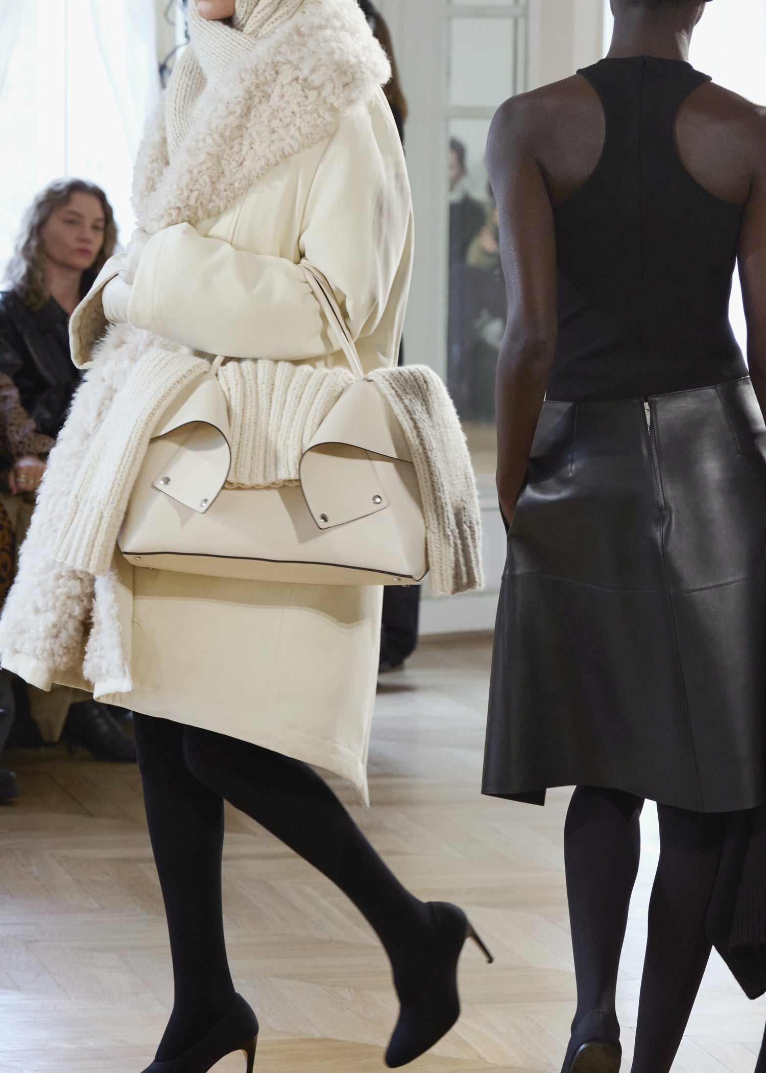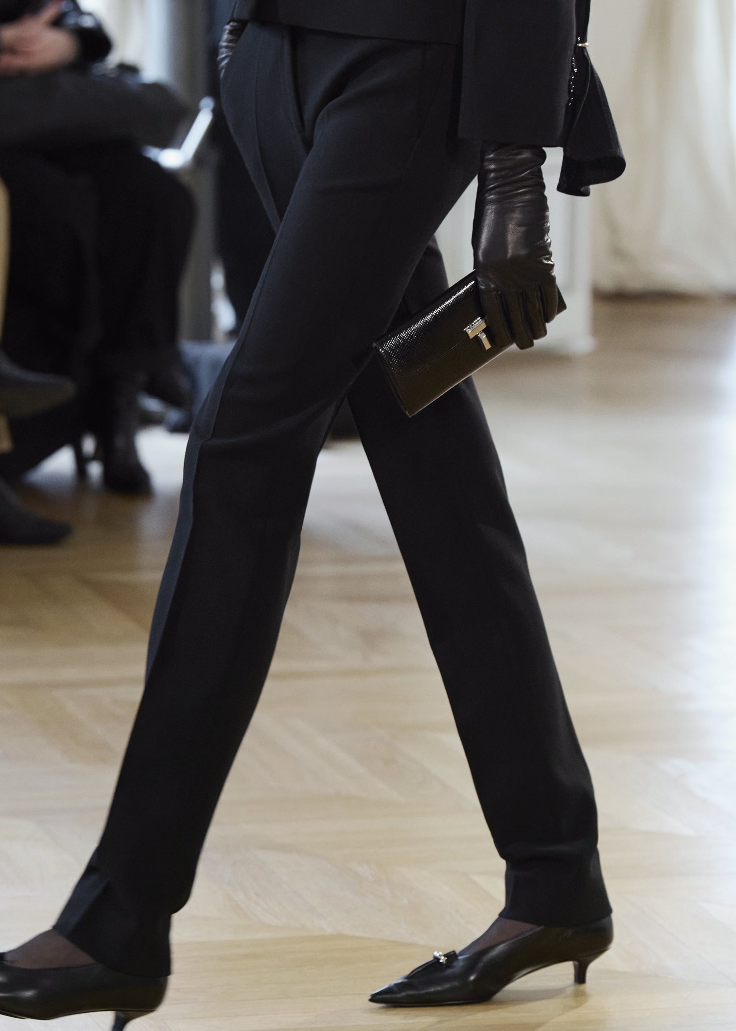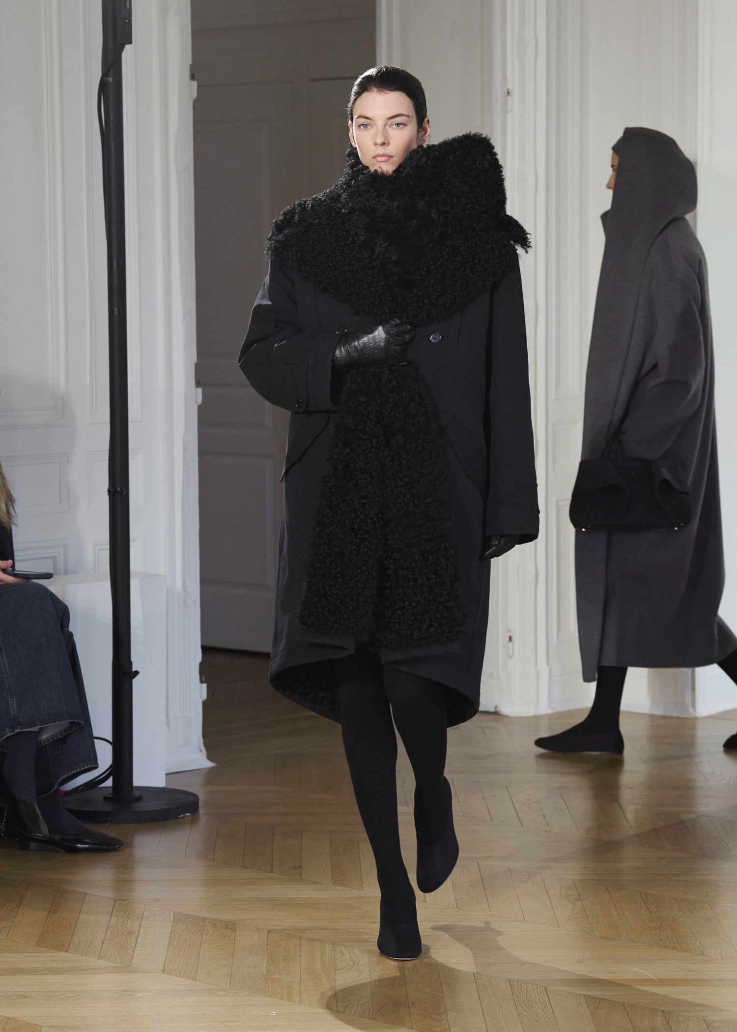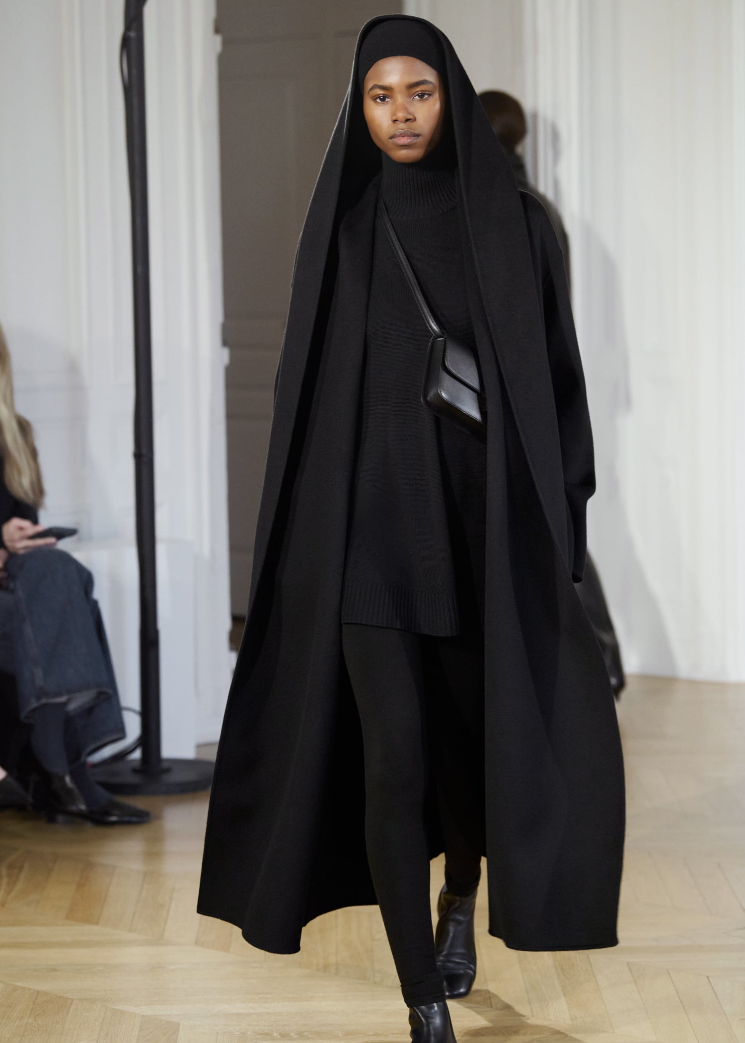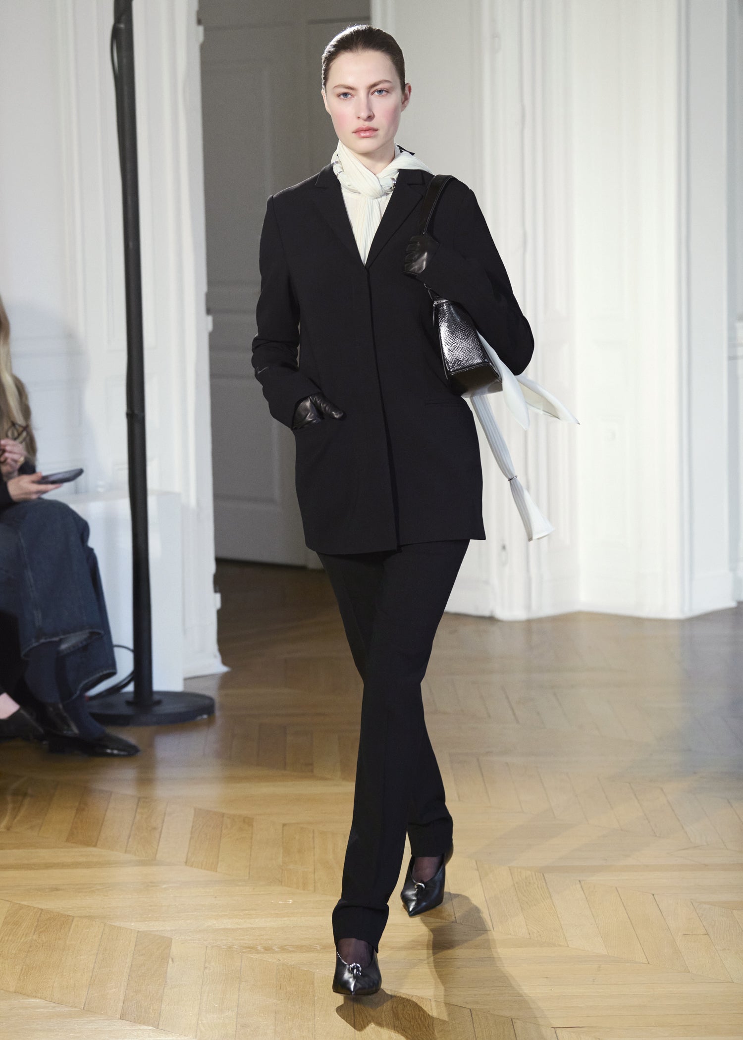 Expressive in its Swedish-inflected sophistication, the Fall Winter 26 runway collection is an exercise in feminine verve. Athletic, wardrobe-building pieces are lent renewed stridency with the kick of a sculptural silhouette. Seemingly minimalist fabrics in shades of noir, with a pop of cherry red, are endowed with unexpected drama, including buttery leather lined with cashmere. Pierced-toe leather pumps lend edge and bags skew city-slick, with the biker-coded Mercer tote joining the lineup alongside the T-lock slung crossbody on ornamental chains. True to TOTEME, each look is an invitation to personality, serving a woman of substance.