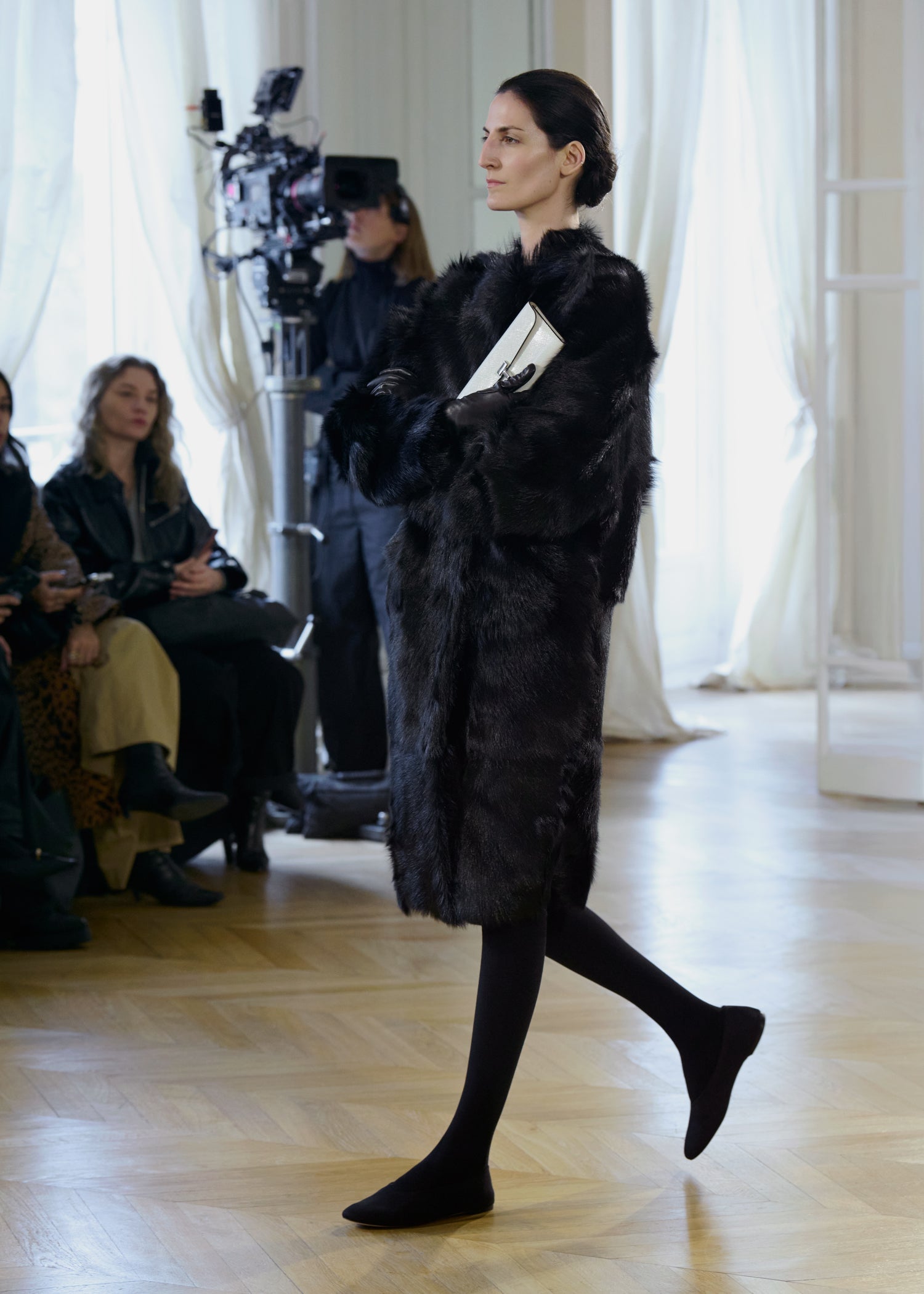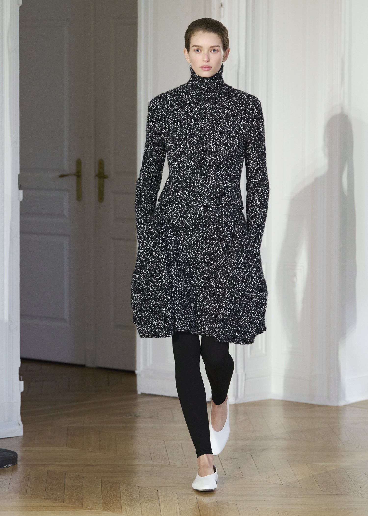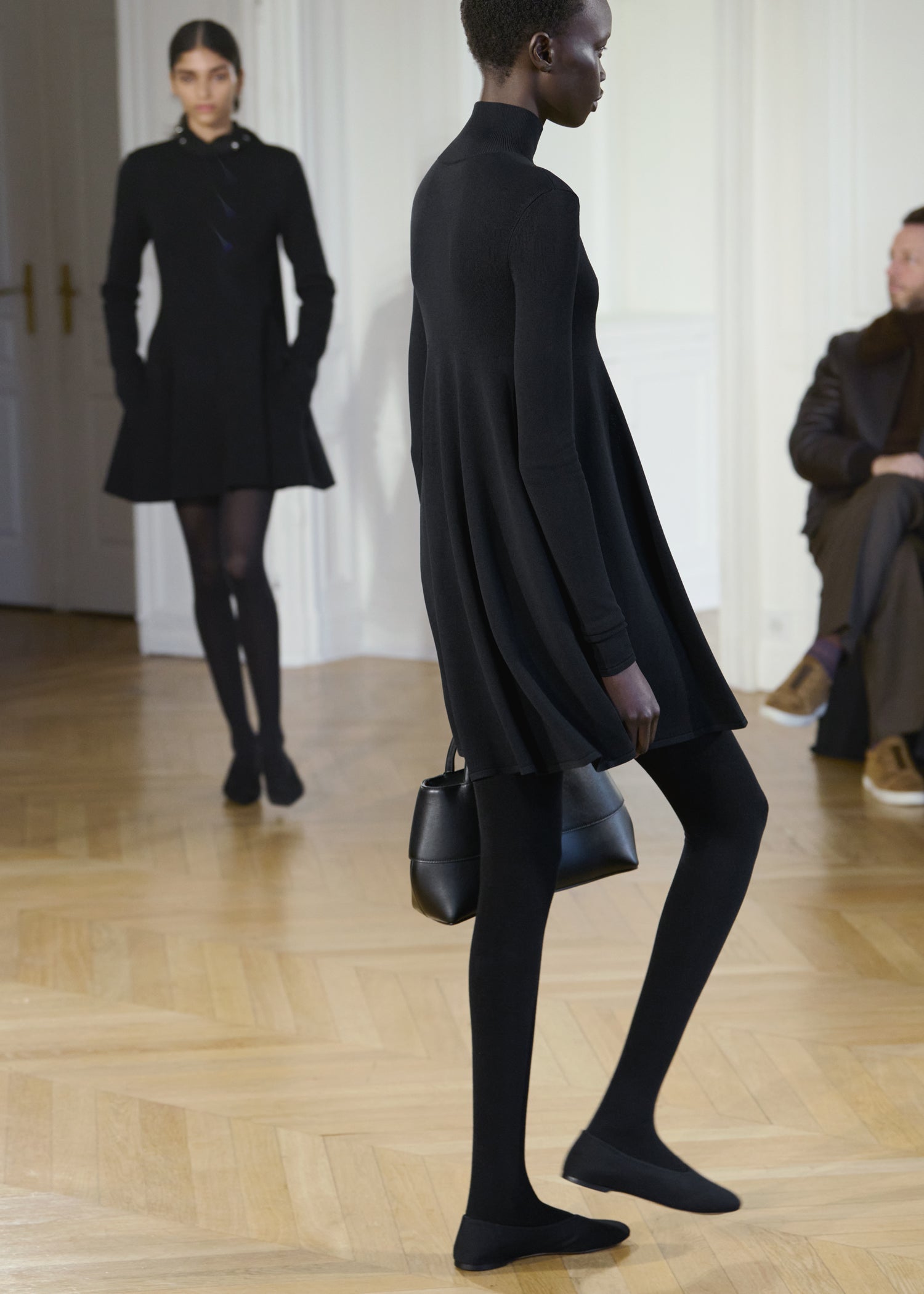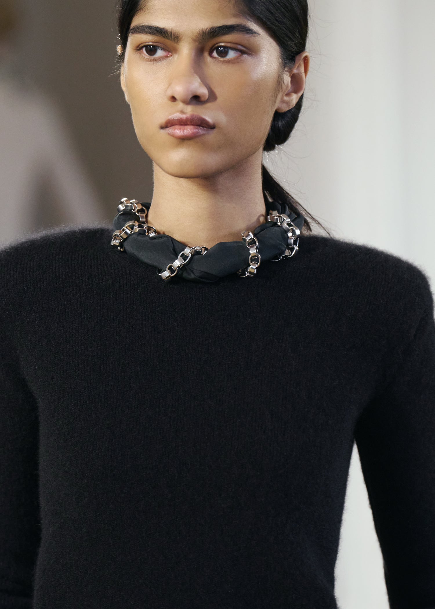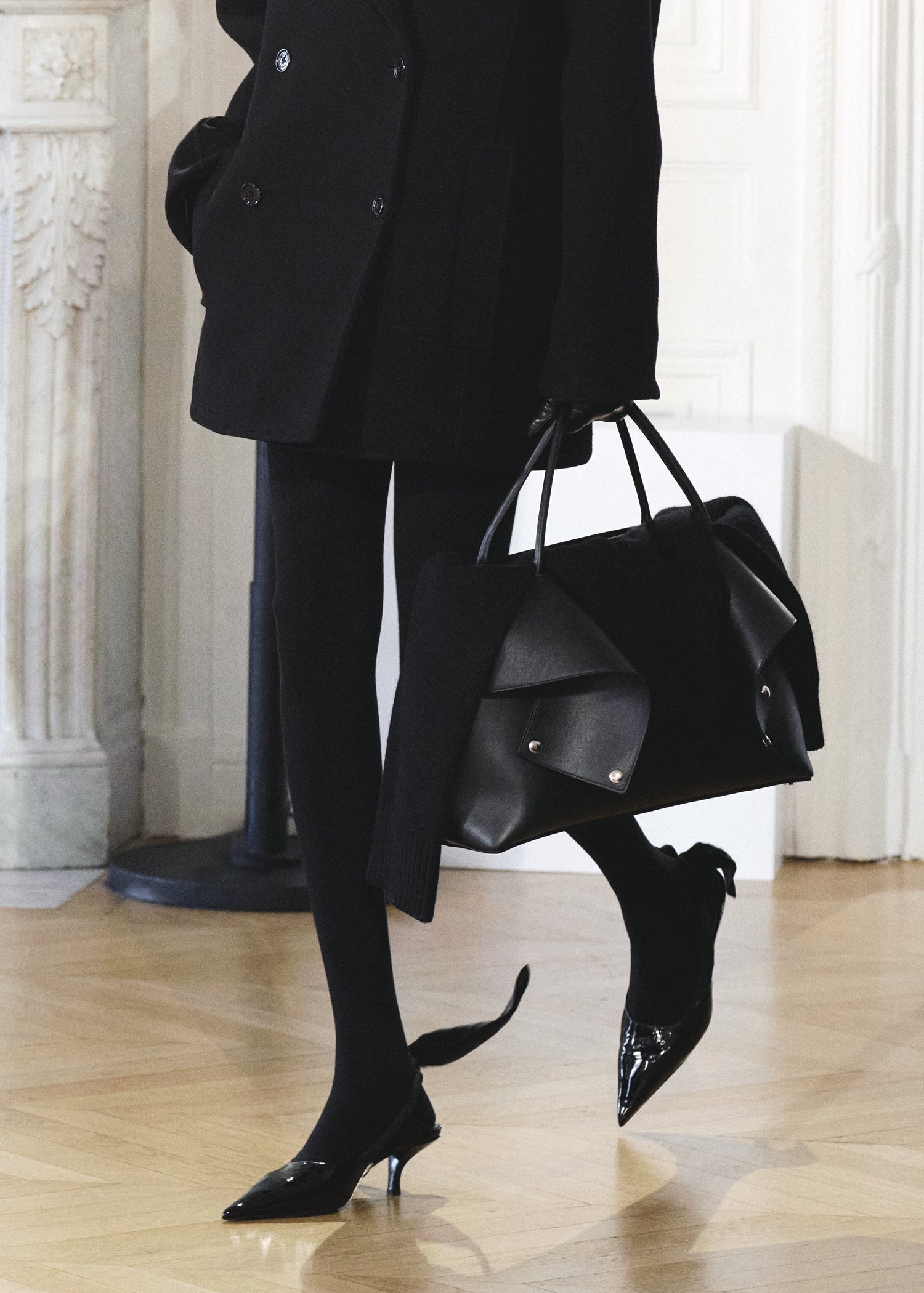 Expressive in its Swedish-inflected sophistication, the Fall Winter 26 runway collection is an exercise in feminine verve. Athletic, wardrobe-building pieces are lent renewed stridency with the kick of a sculptural silhouette. Seemingly minimalist fabrics in shades of noir, with a pop of cherry red, are endowed with unexpected drama, including buttery leather lined with cashmere. Pierced-toe leather pumps lend edge and bags skew city-slick, with the biker-coded Mercer tote joining the lineup alongside the T-lock slung crossbody on ornamental chains. True to TOTEME, each look is an invitation to personality, serving a woman of substance.