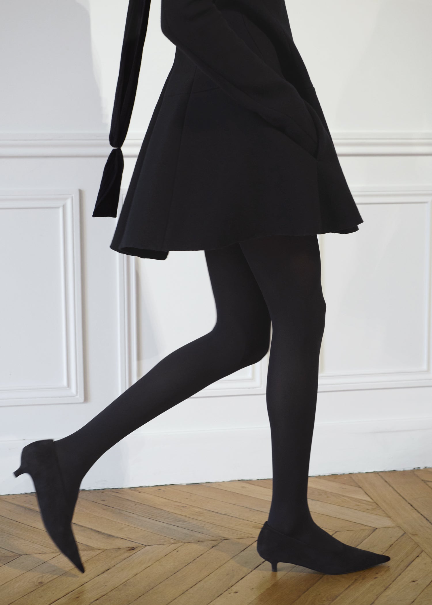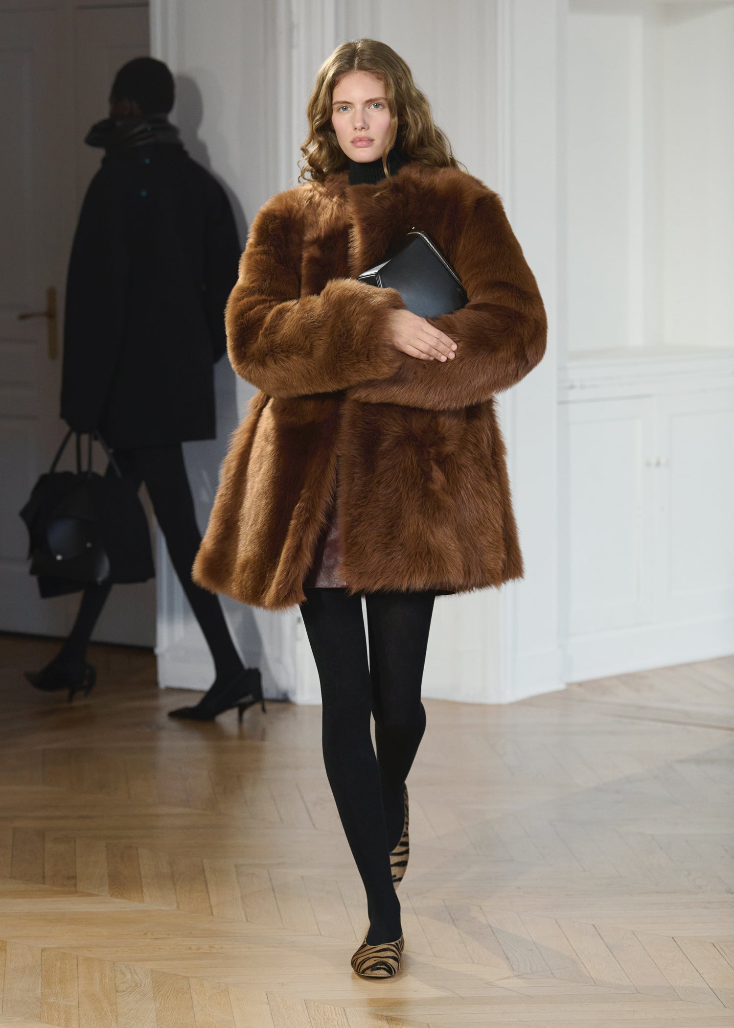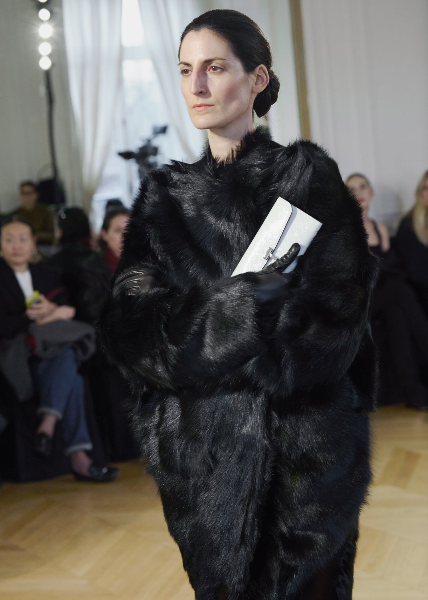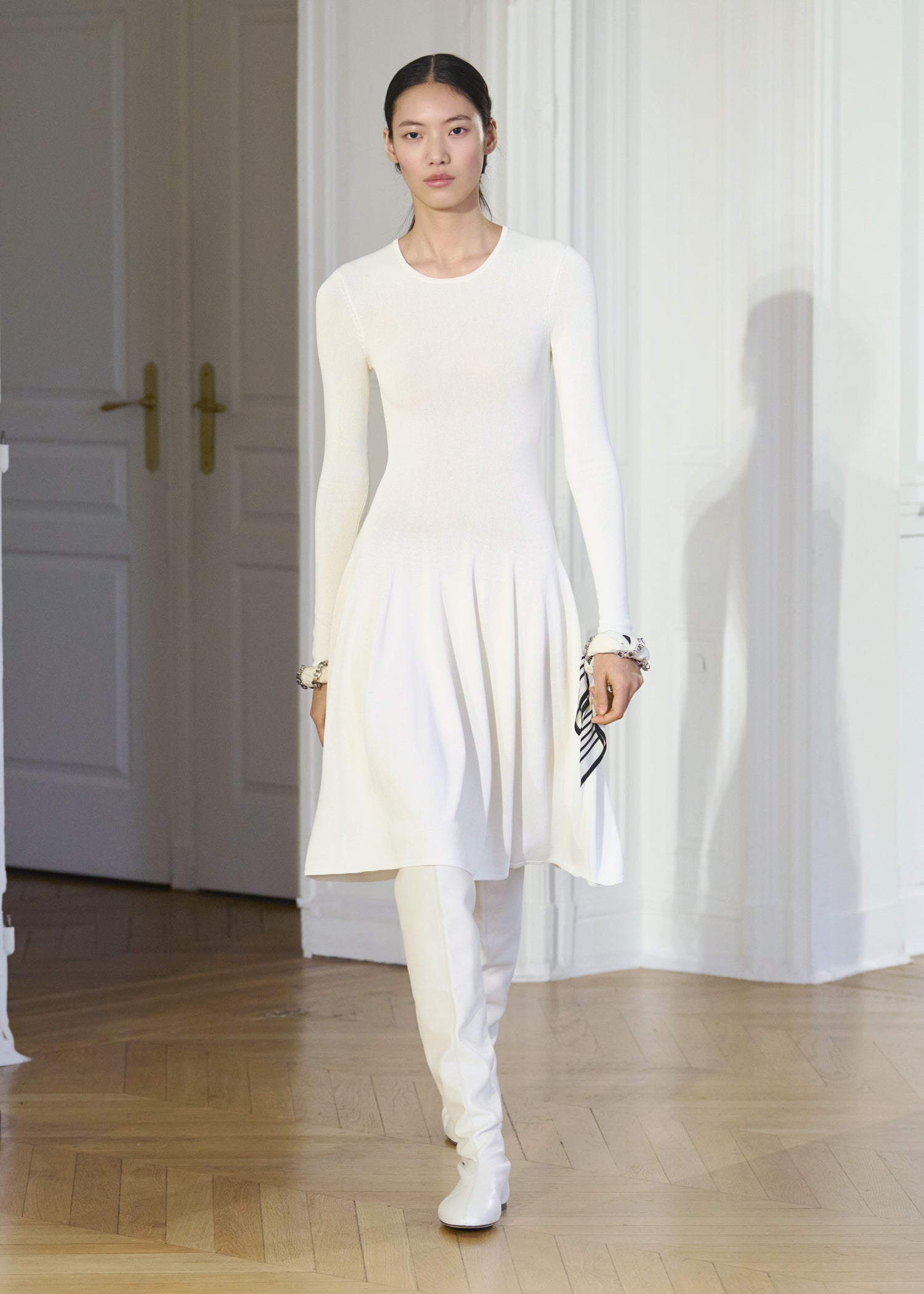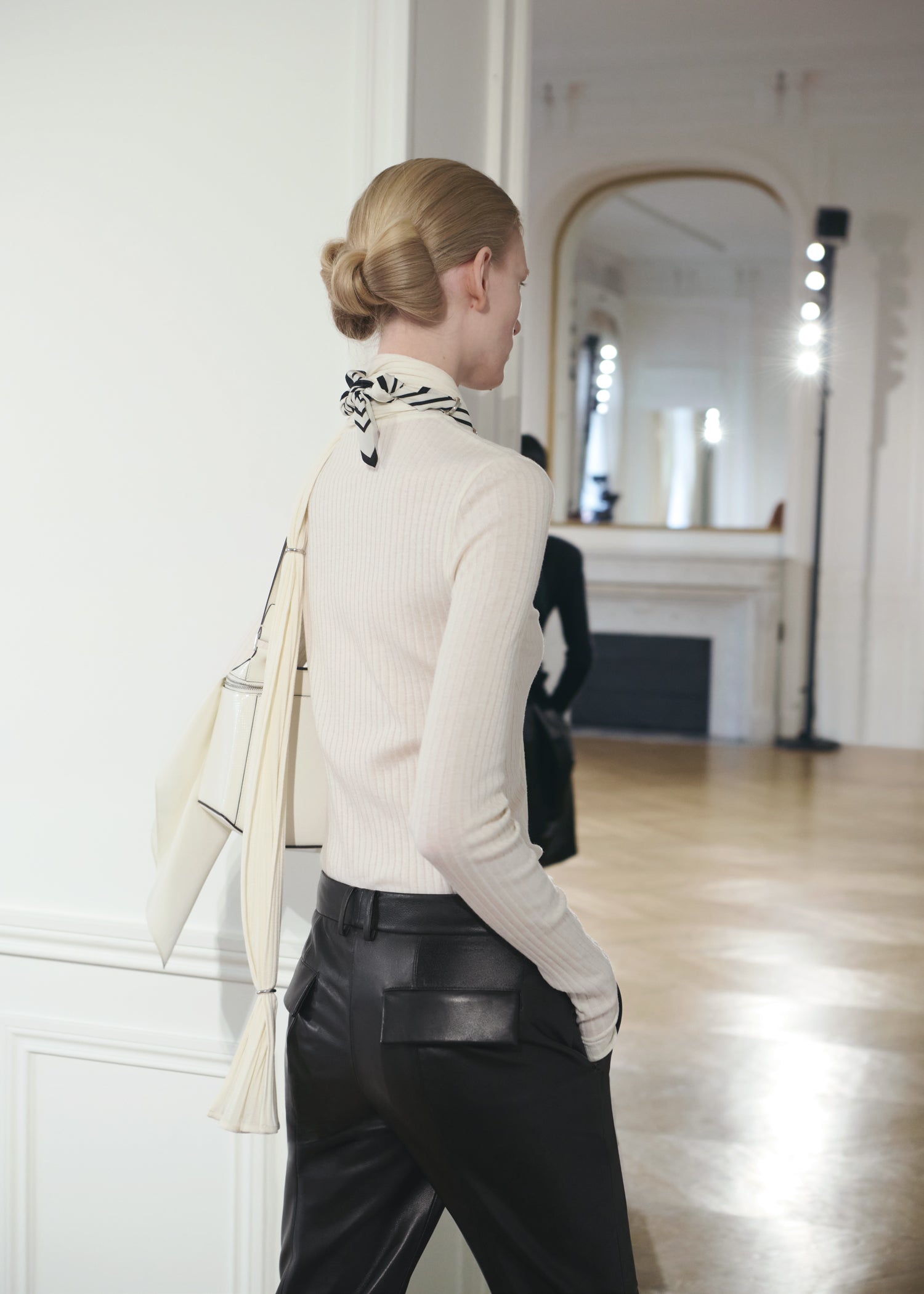 Expressive in its Swedish-inflected sophistication, the Fall Winter 26 runway collection is an exercise in feminine verve. Athletic, wardrobe-building pieces are lent renewed stridency with the kick of a sculptural silhouette. Seemingly minimalist fabrics in shades of noir, with a pop of cherry red, are endowed with unexpected drama, including buttery leather lined with cashmere. Pierced-toe leather pumps lend edge and bags skew city-slick, with the biker-coded Mercer tote joining the lineup alongside the T-lock slung crossbody on ornamental chains. True to TOTEME, each look is an invitation to personality, serving a woman of substance.