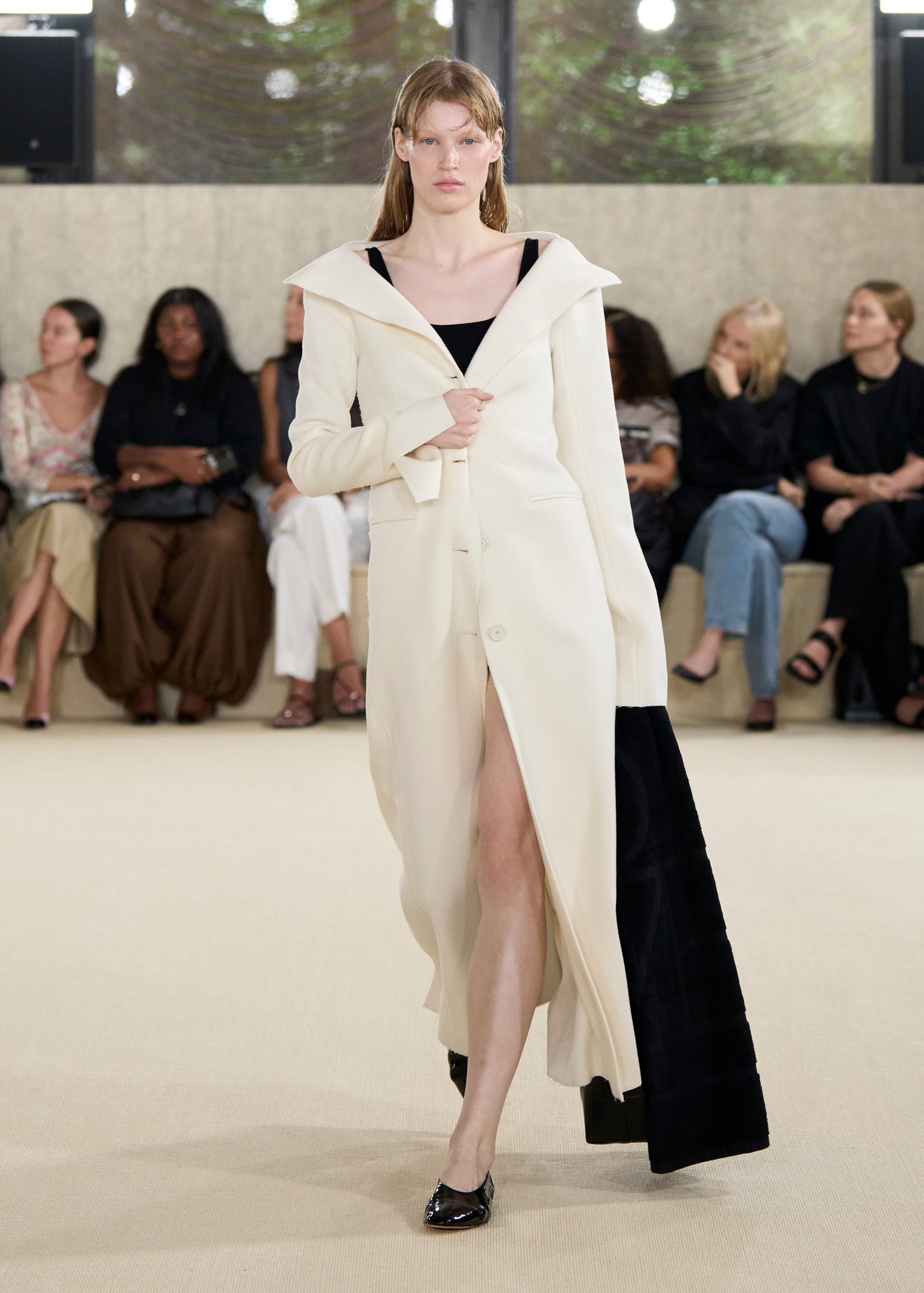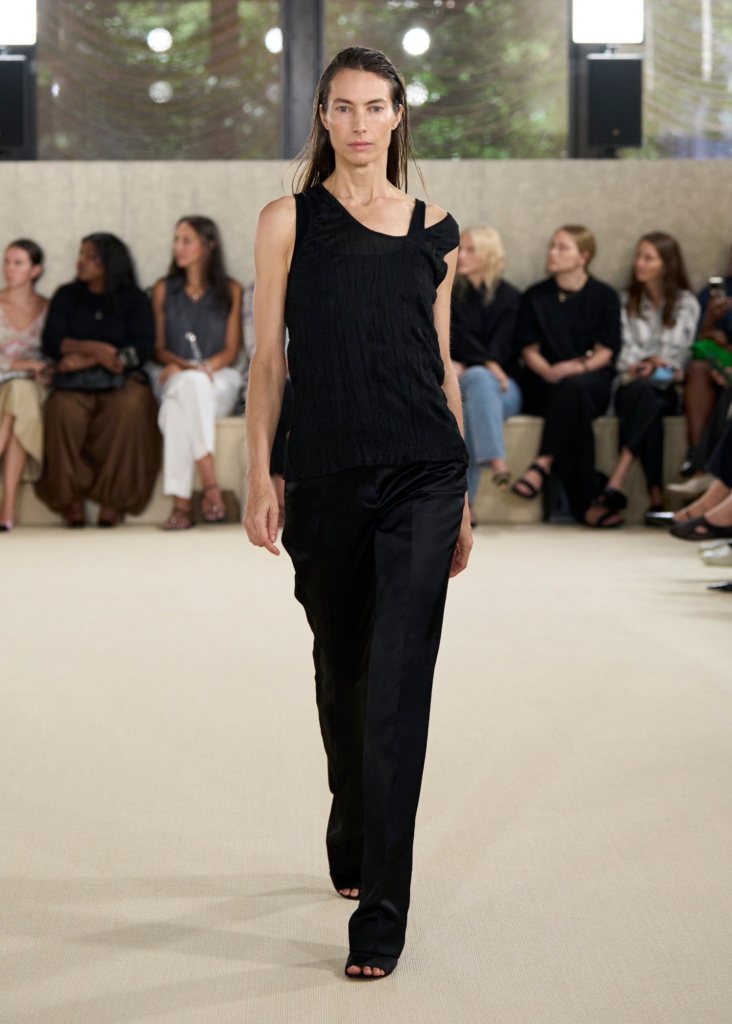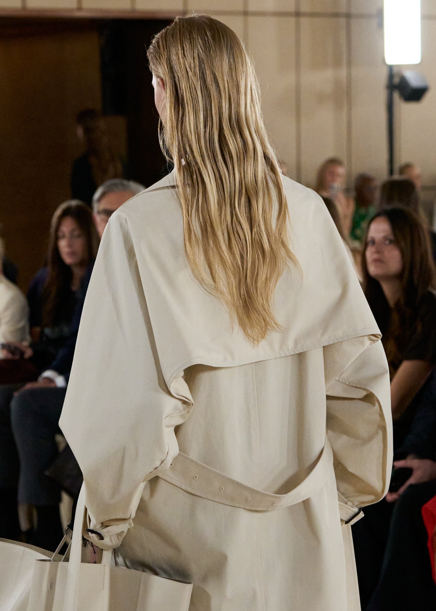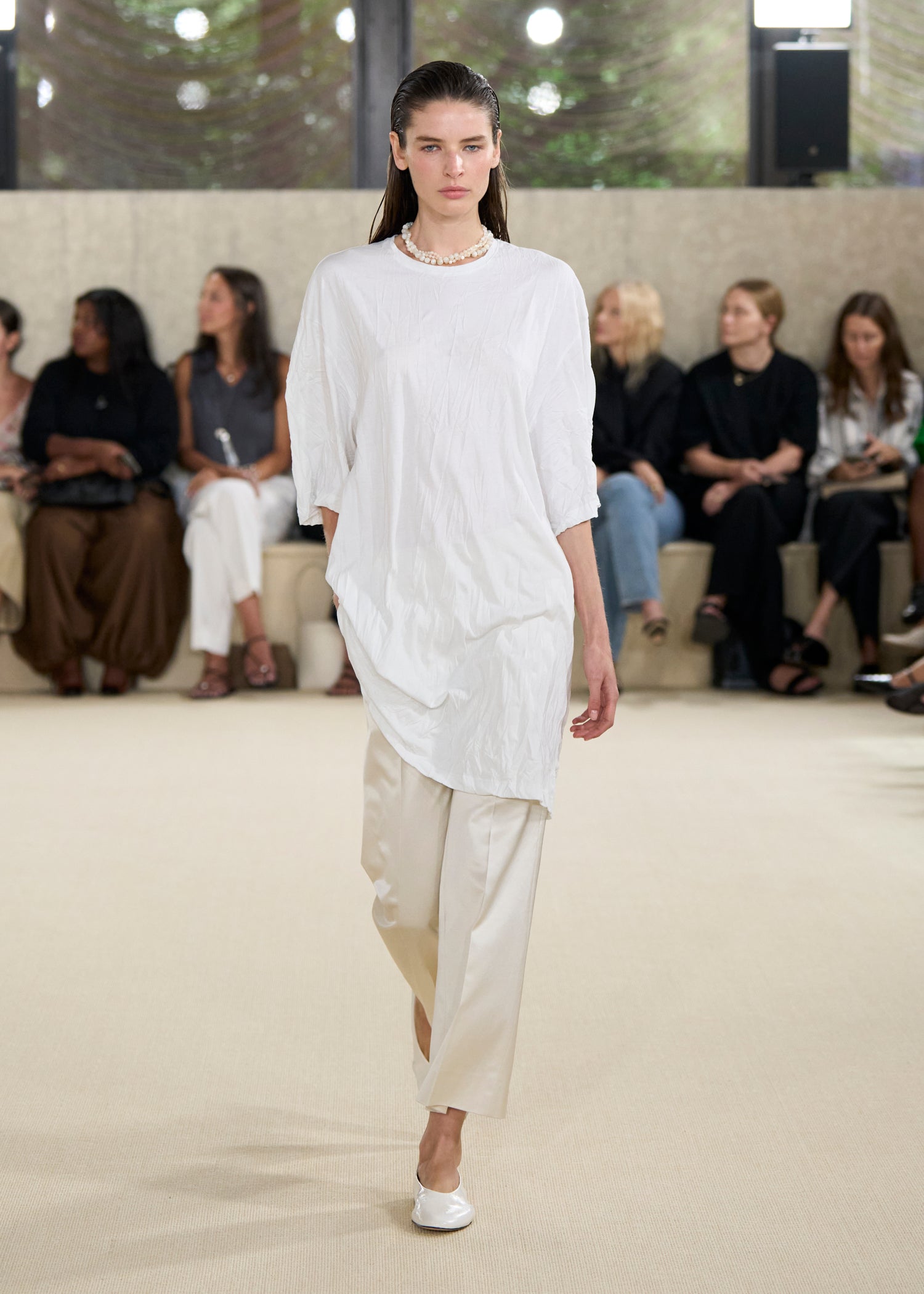 The Spring Summer 26 runway collection distills undone beauty. TOTEME icons like the tank, trench coat and pajama are deconstructed with easy-going precision, unravelling finishes, and a liberating mix of time-softened textures.