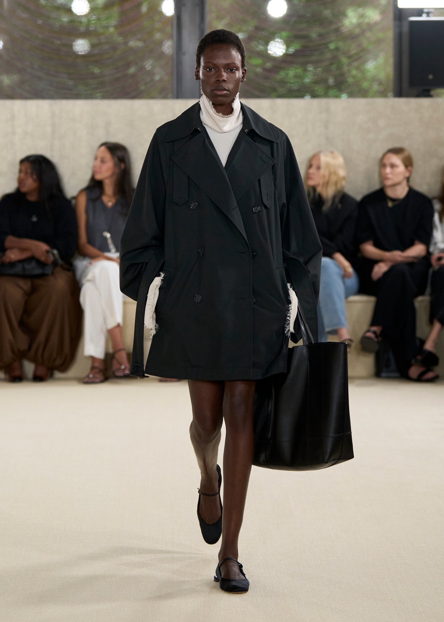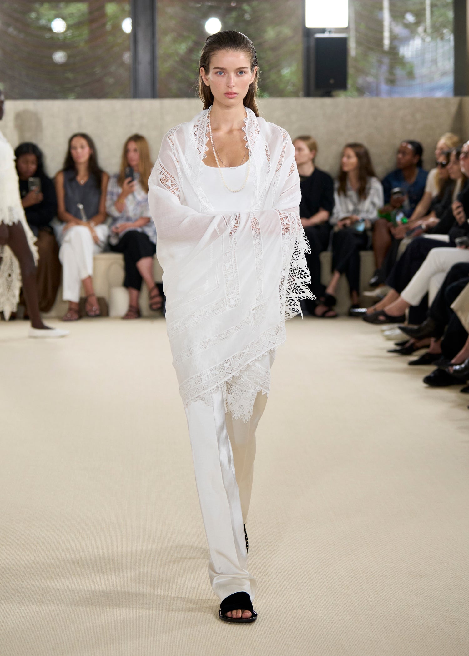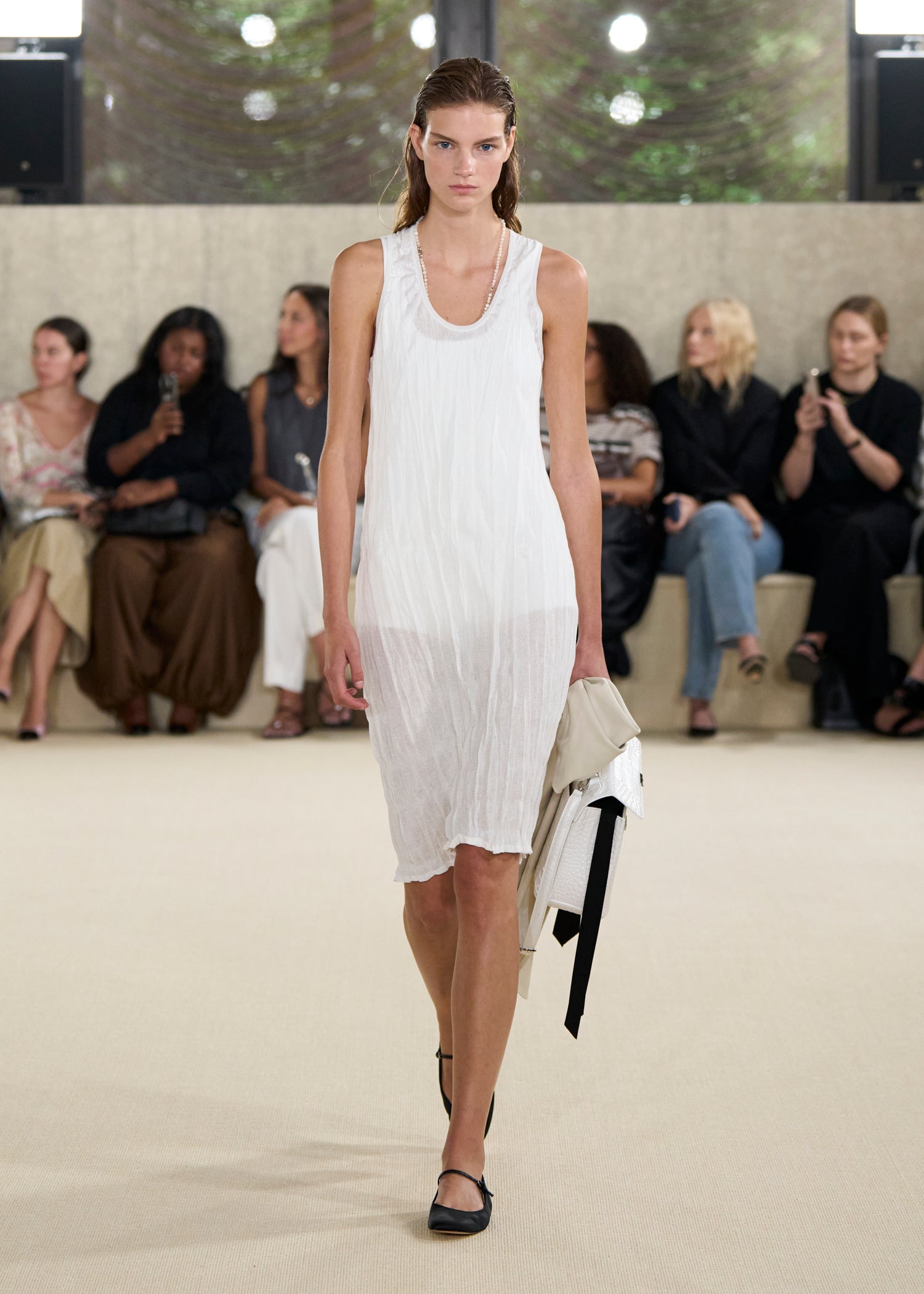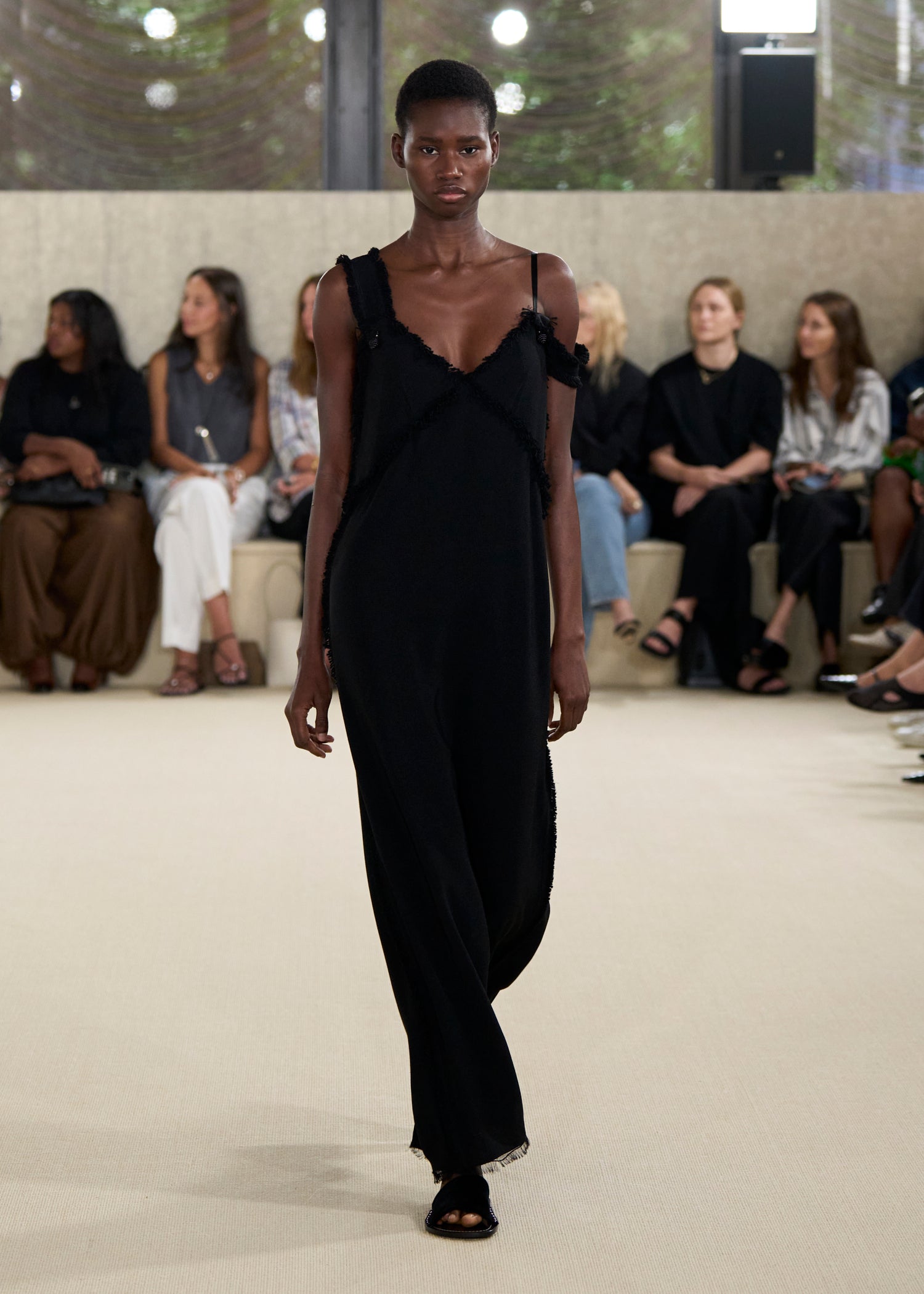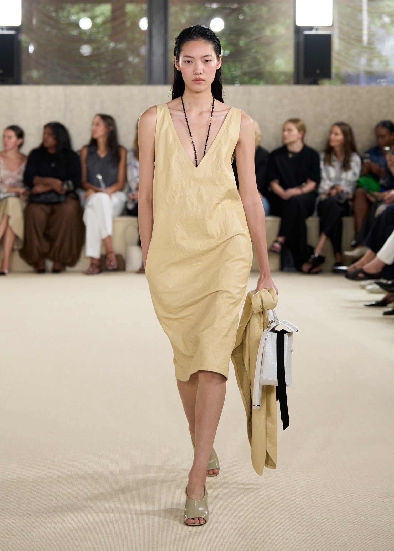 The Spring Summer 26 runway collection distills undone beauty. TOTEME icons like the tank, trench coat and pajama are deconstructed with easy-going precision, unravelling finishes, and a liberating mix of time-softened textures.