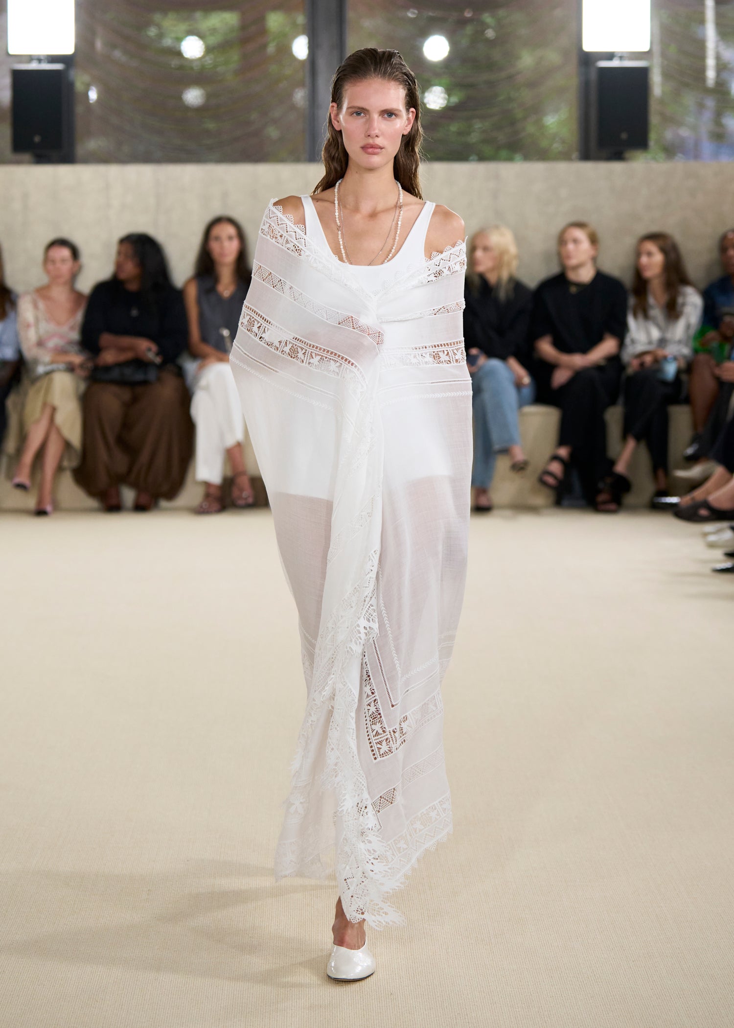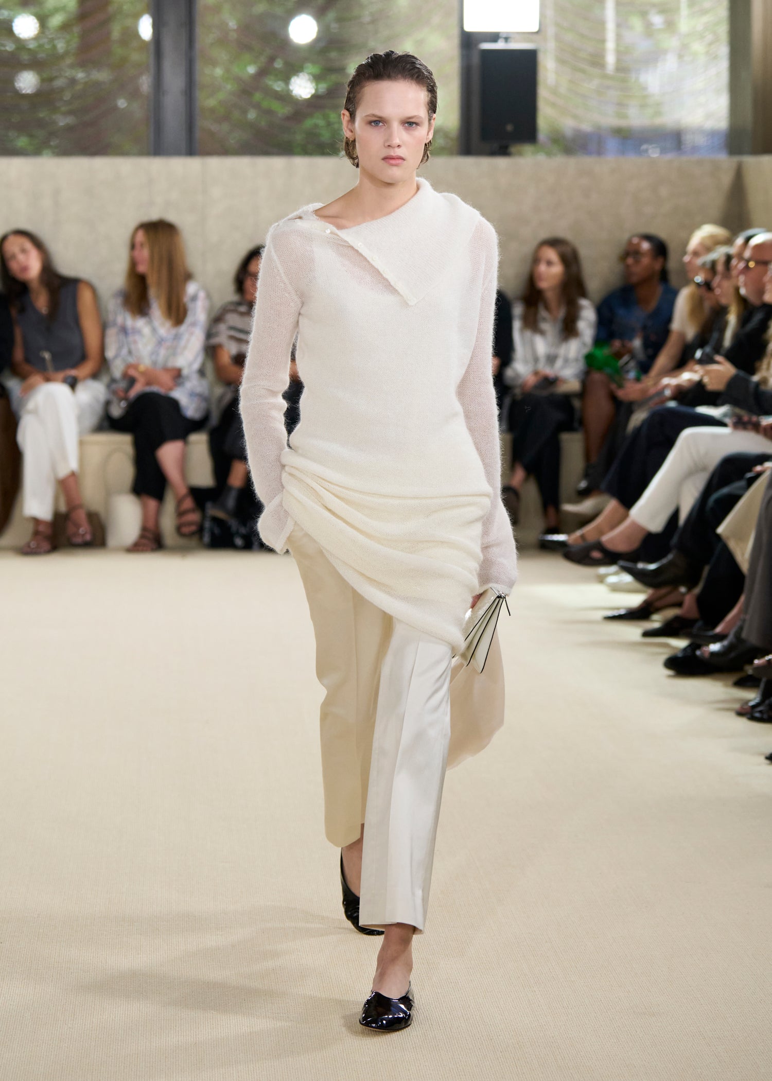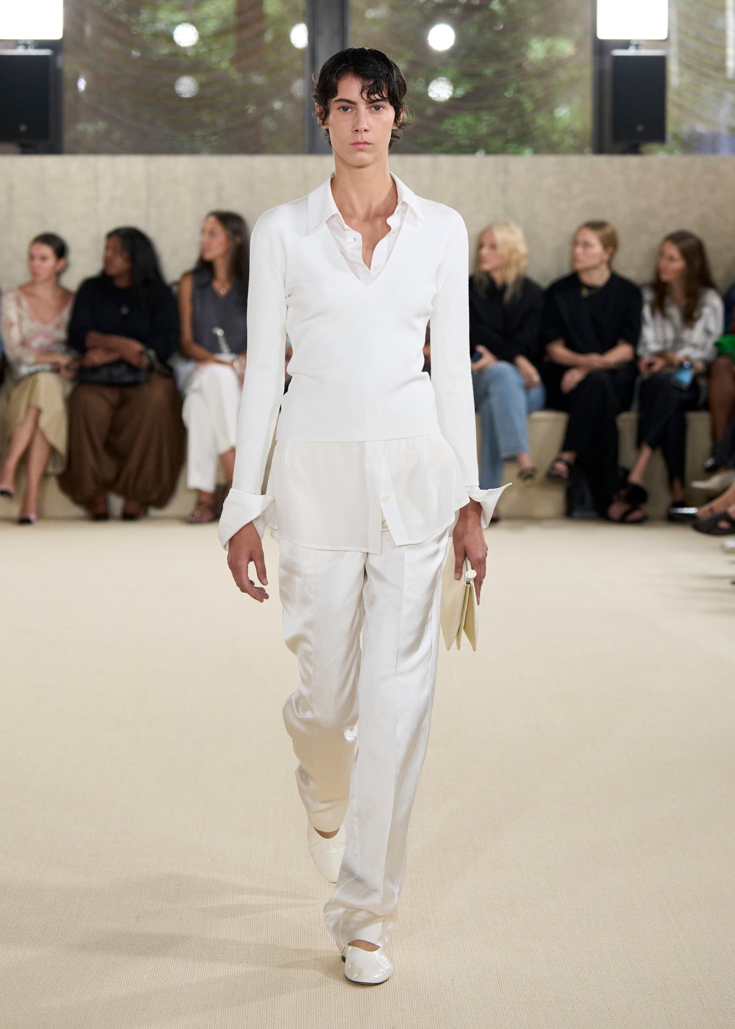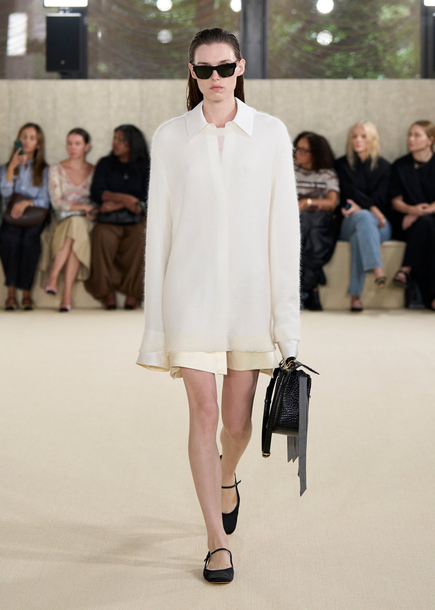 The Spring Summer 26 runway collection distills undone beauty. TOTEME icons like the tank, trench coat and pajama are deconstructed with easy-going precision, unravelling finishes, and a liberating mix of time-softened textures.