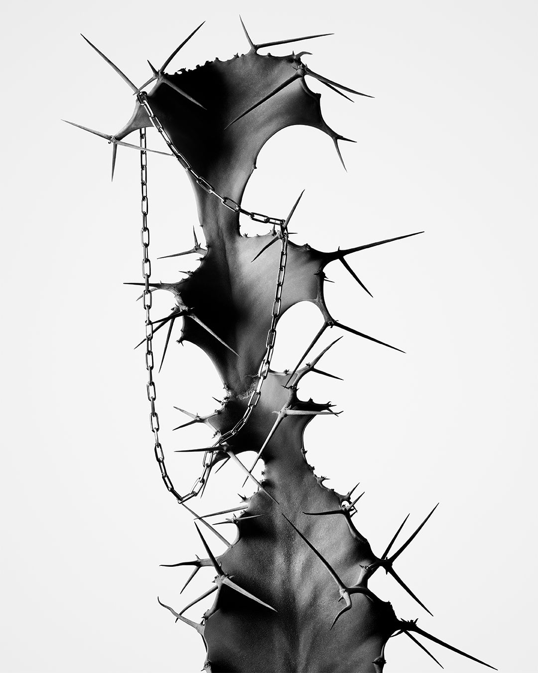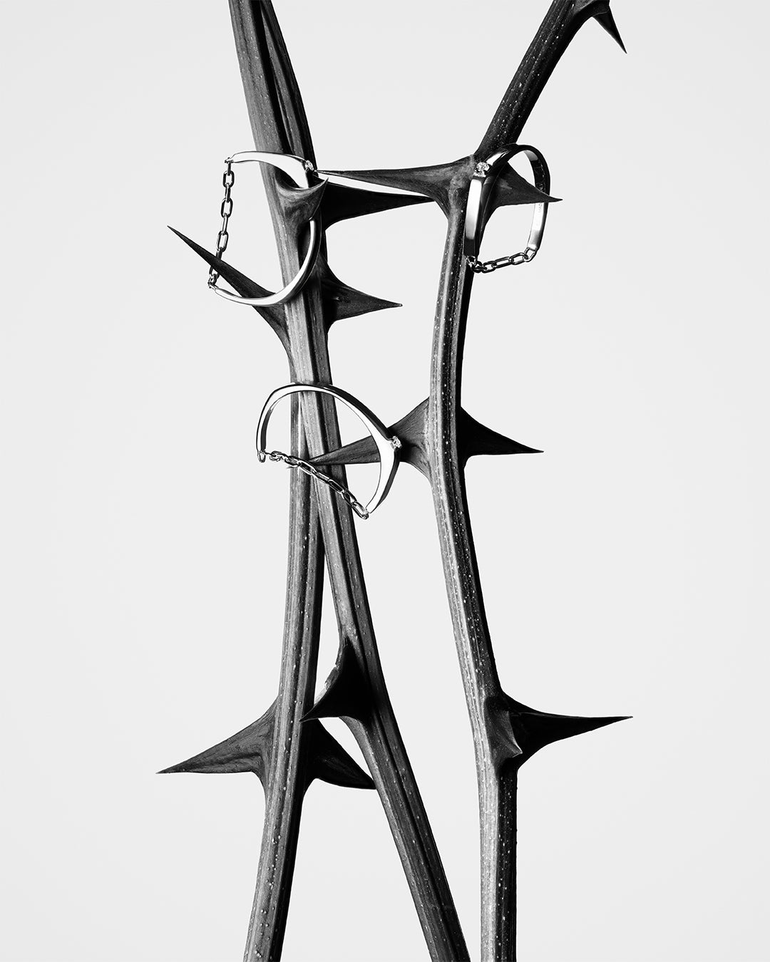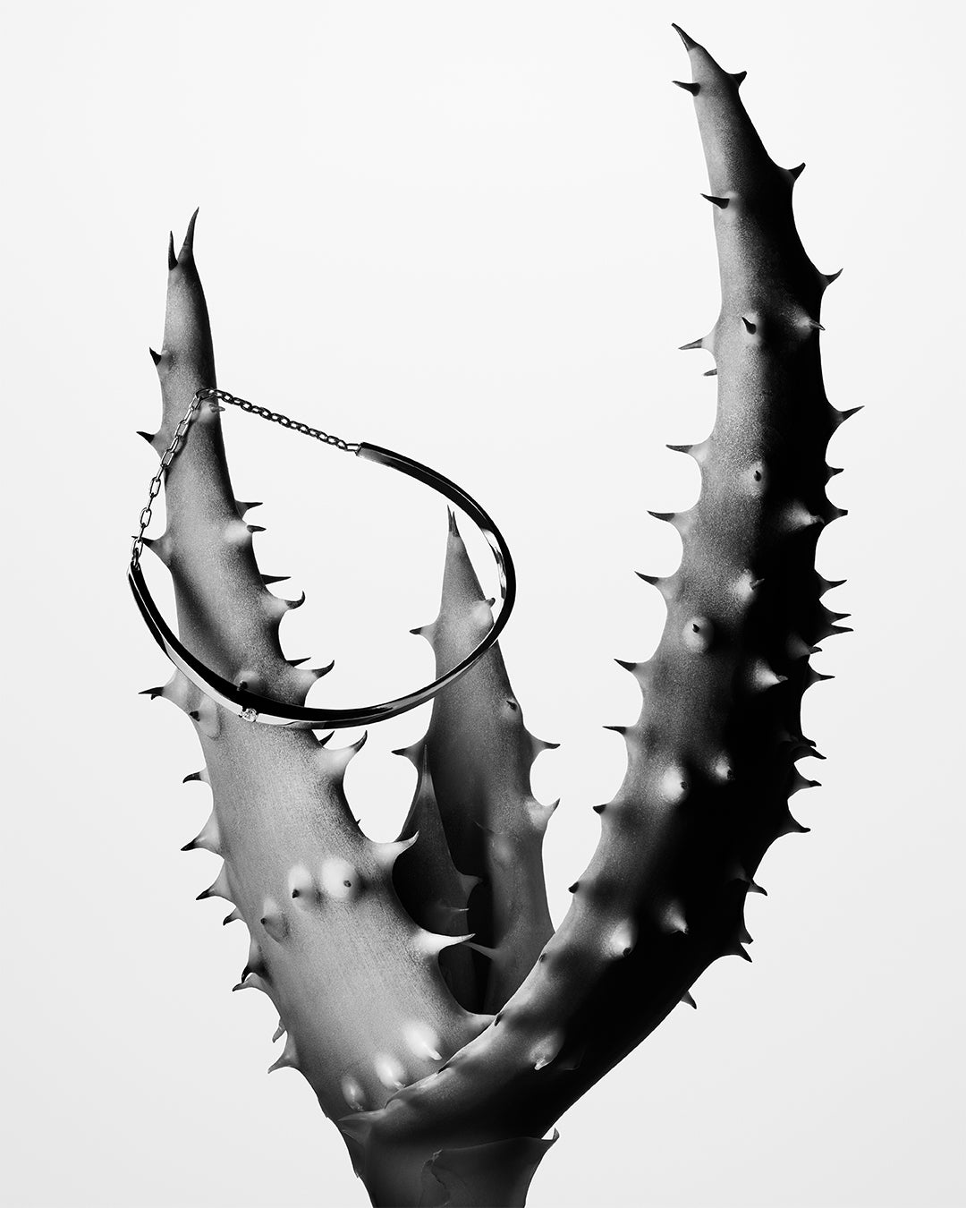 With THORNS, Guido Mocafico crafts a precise visual language that frames jewelry within nature’s own design. Each composition presents desert and succulent plants, including teasel, acacia, aloe marothii, and cow’s horn plant, as sculptural counterparts to TOTEME’s jewelry. The pairing of organic forms with the collection’s clean lines and refined materiality reflects nature’s sculptural mastery and the jewelry's precise design language. The dialogue of shapes, distinct yet delicate, imbues the jewelry with a sense of resilience. Through Mocafico’s lens, jewelry and plants resonate with a shared essence of refinement and depth.